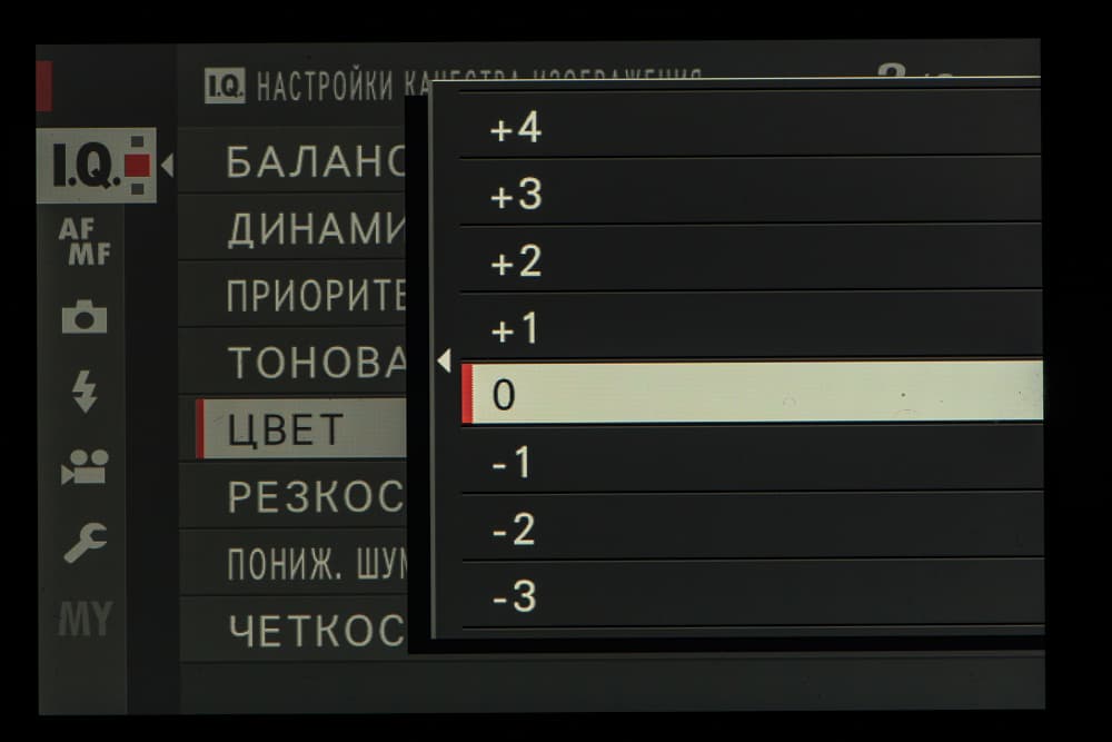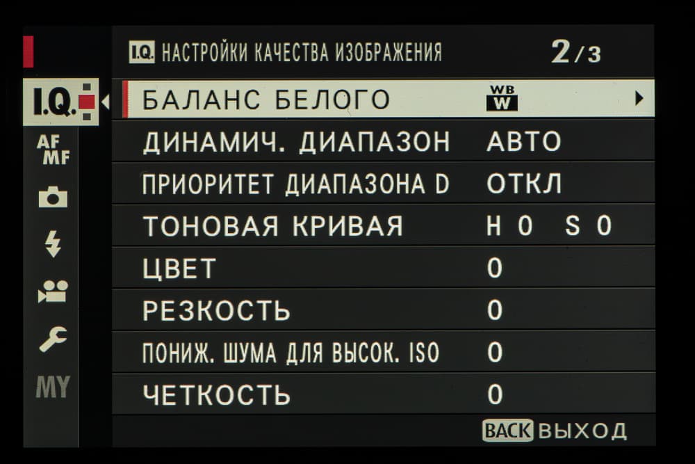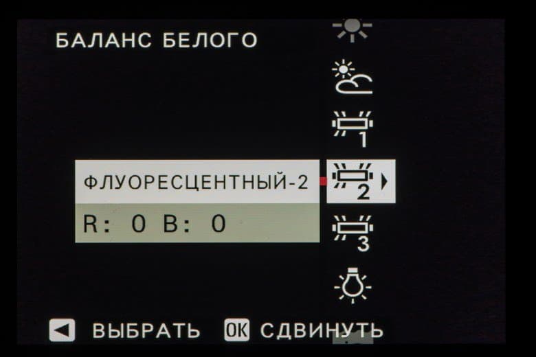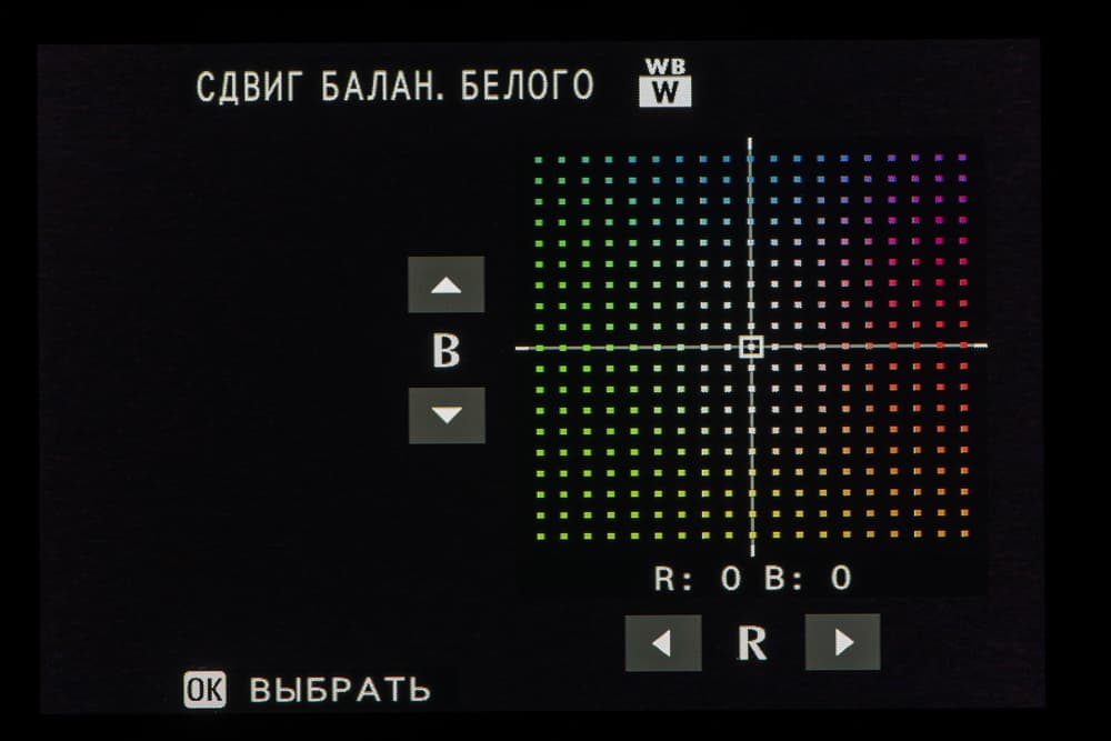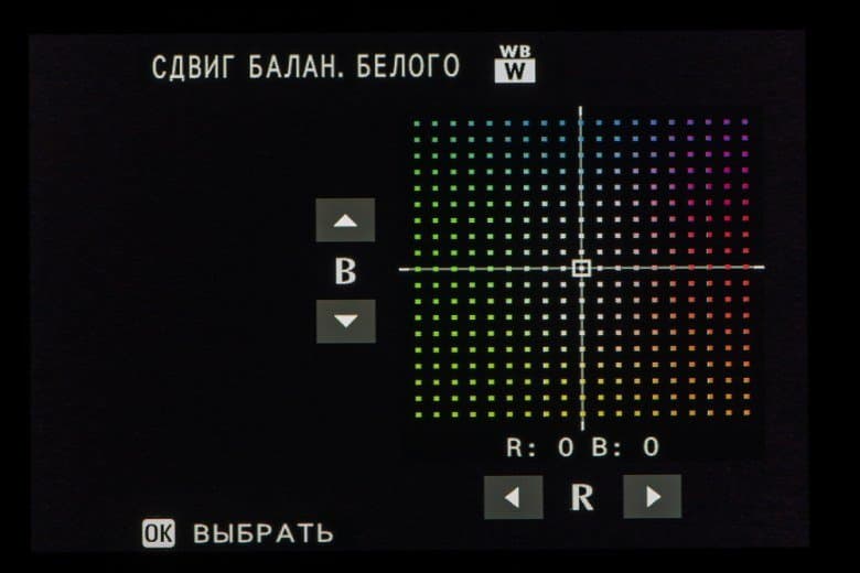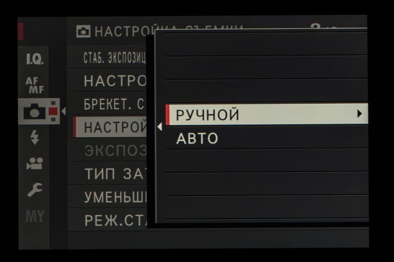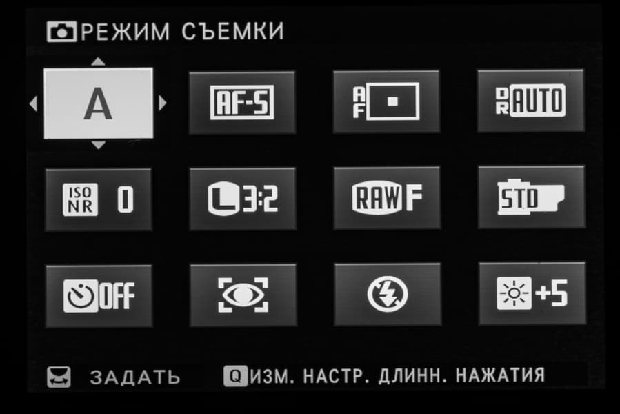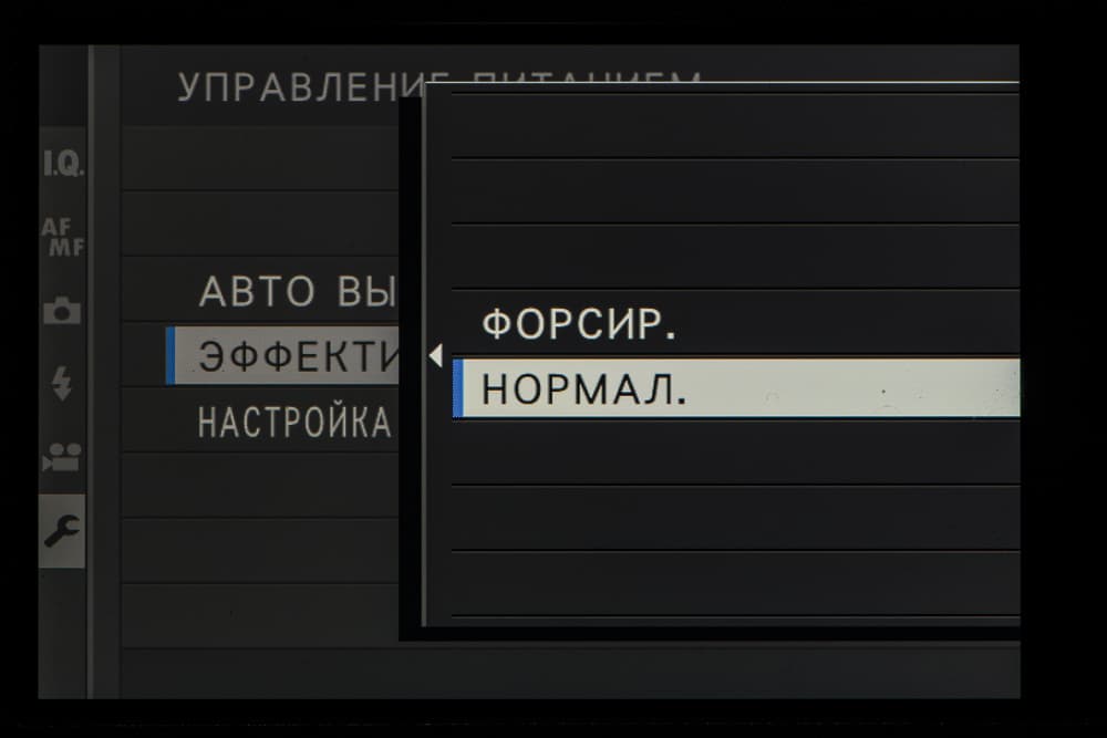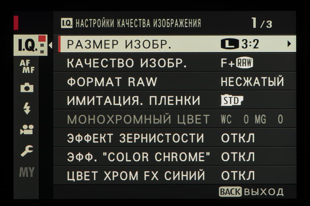 Выбор пленки желаемого типа доступен из быстрого меню. Листание производится колесом левого селектора. Эффекты постобработки применяются, естественно, только к JPEG, параллельно можно сохранить файл в формате RAW.