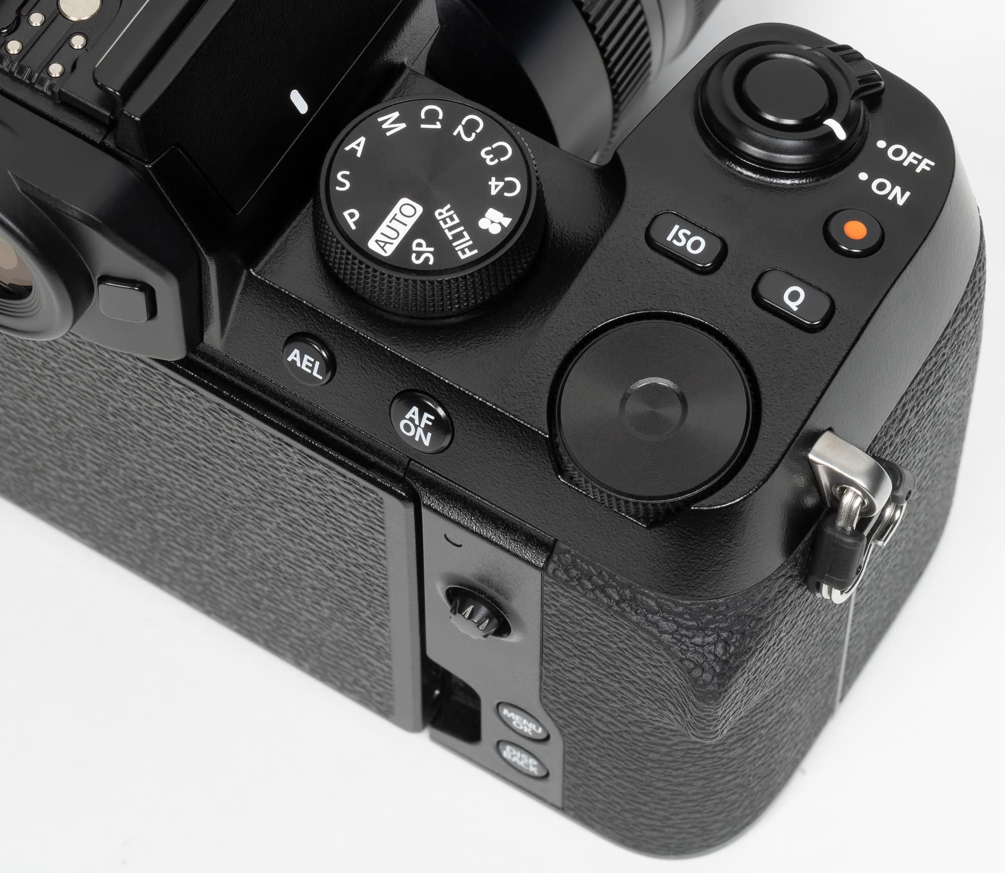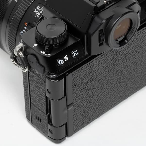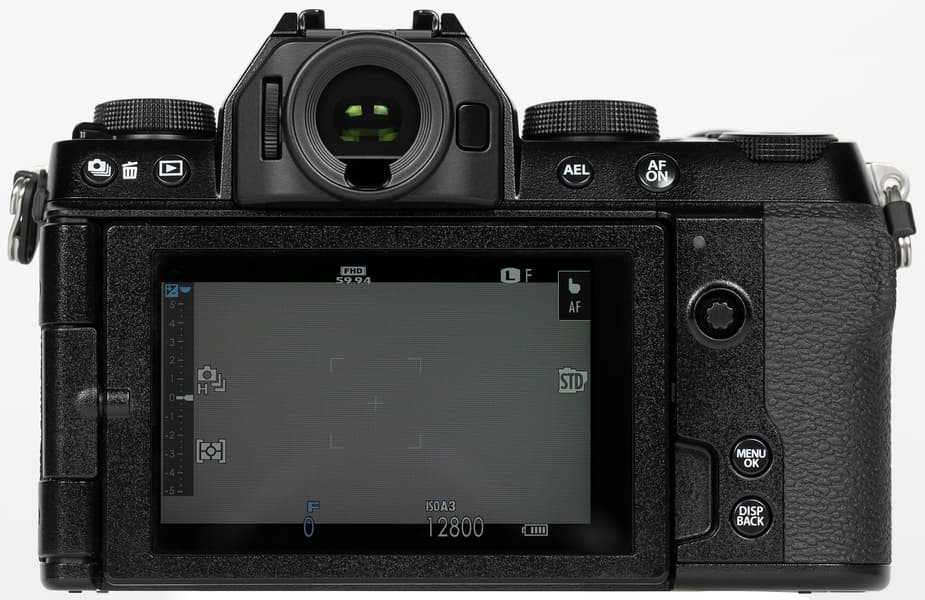 Сзади главными деталями являются дисплей и окуляр видоискателя. Слева от последнего помещается колесико диоптрийной регулировки, справа — функциональная кнопка, снизу — датчик затенения для автоматического переключения визирования между видоискателем и дисплеем. Слева вверху имеются кнопки выбора режима «протяжки» (а также стирания отснятого материала) и активации режима просмотра, справа вверху — кнопка экспопамяти (AEL) и принудительной активации автофокуса (AFON), а справа внизу — органы управления меню. Пятипозиционного селектора нет; его функции по навигации целиком переданы мини-джойстику (подобно тому, как это реализовано в любительских моделях Fujifilm X-T200 и Fujifilm X-A7).