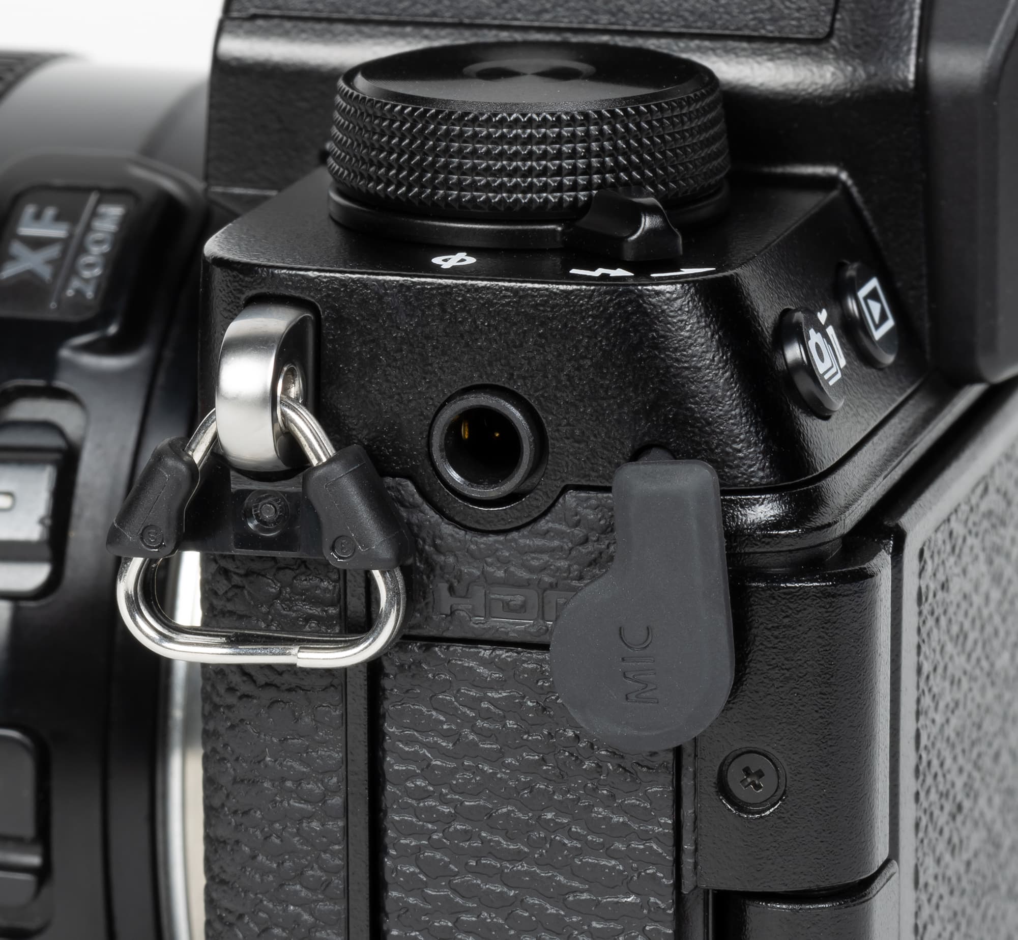Слева на боковой панели под резиновой заглушкой находится разъем для внешнего микрофона, а под ним — крышка отсека с проводными интерфейсами и решетка встроенного громкоговорителя.
