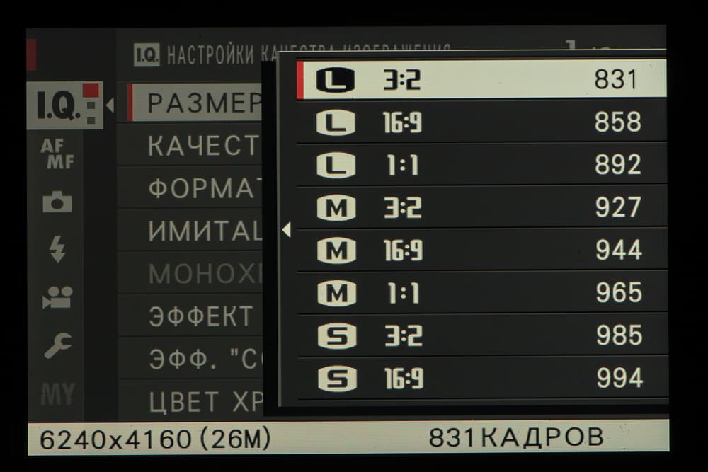 | Разрешение фотоснимков | L: 3:2 6240×4160, 16:9 6240×3512, 1:1 4160×4160; M: 3:2 4416×2944, 16:9 4416×2488, 1:1 2944×2944; S: 3:2 3120×2080, 16:9 3120×1760, 1:1 2080×2080 |