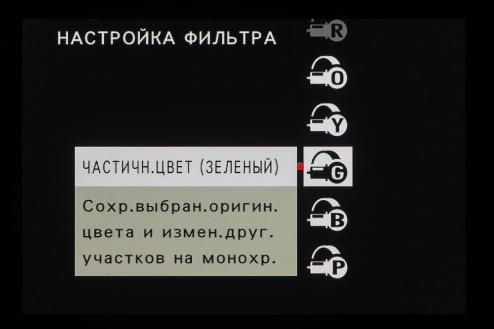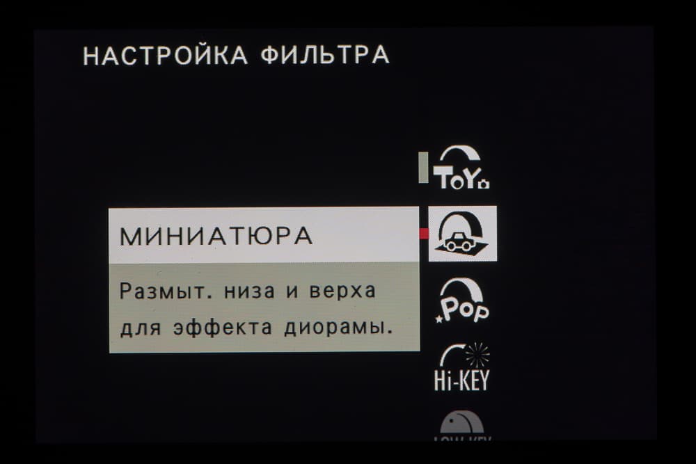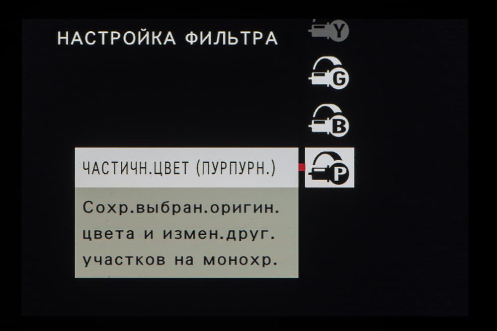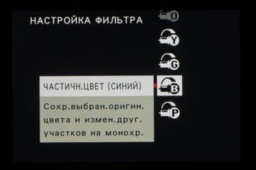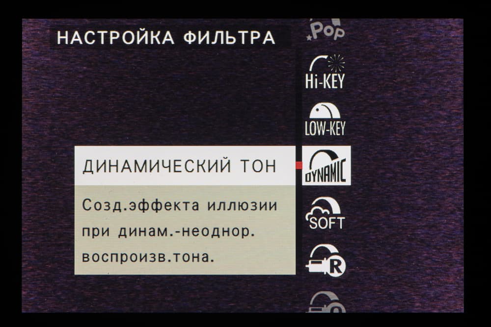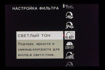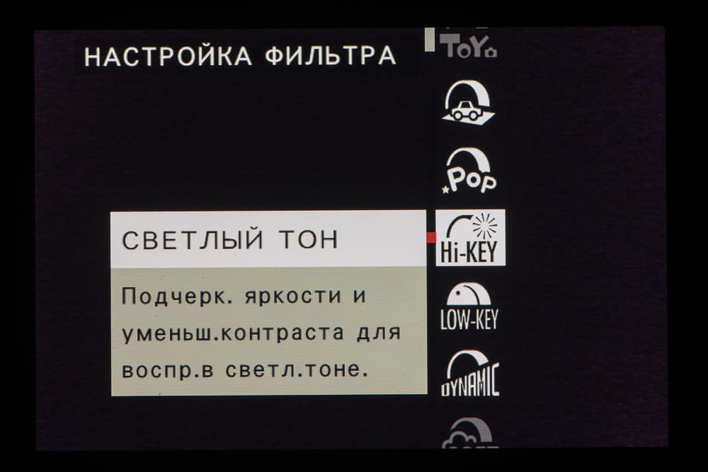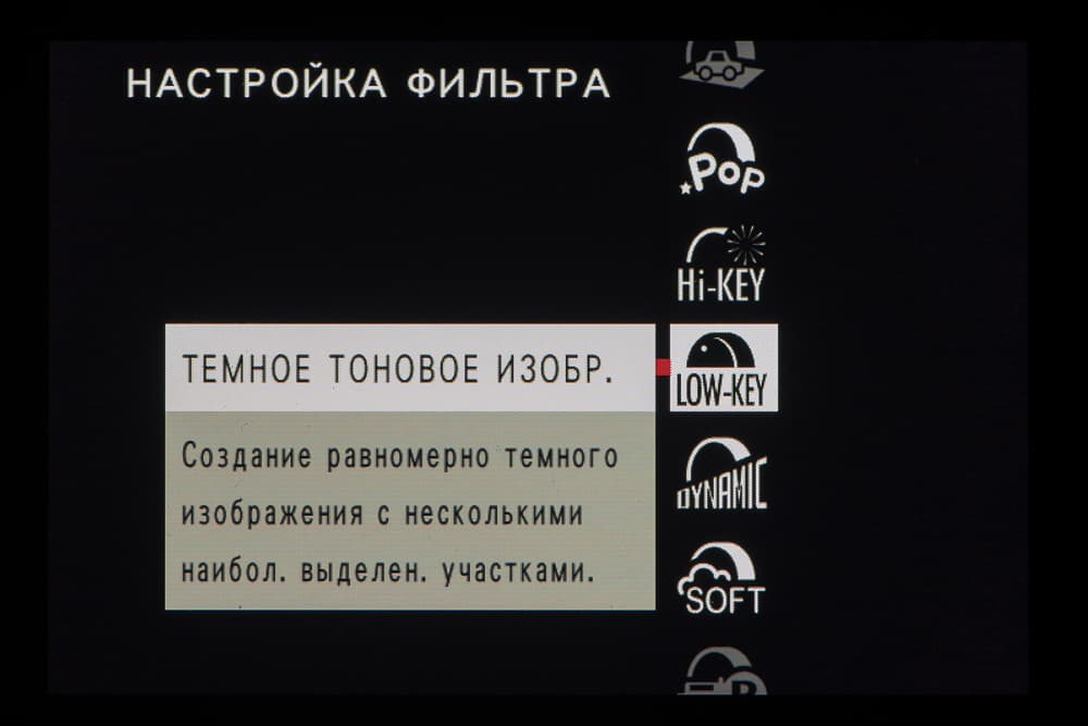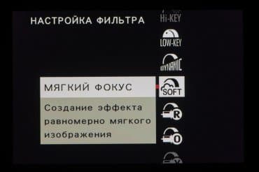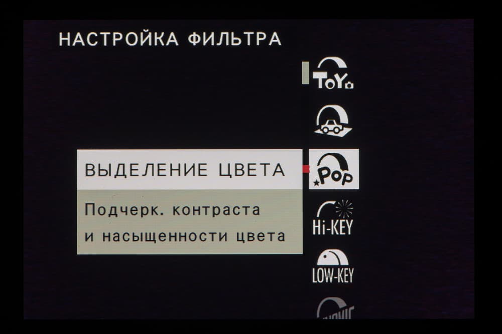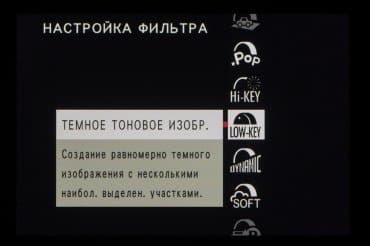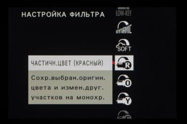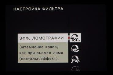 Стиль внутрикамерной постобработки доступен при выборе опции Filter на главном селекторе съемочных режимов. Переключение между фильтрами разного типа производится левым немаркированным колесом. Файлы RAW записываются без обработки, последствия применения фильтров видны только в JPEG.