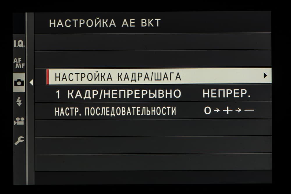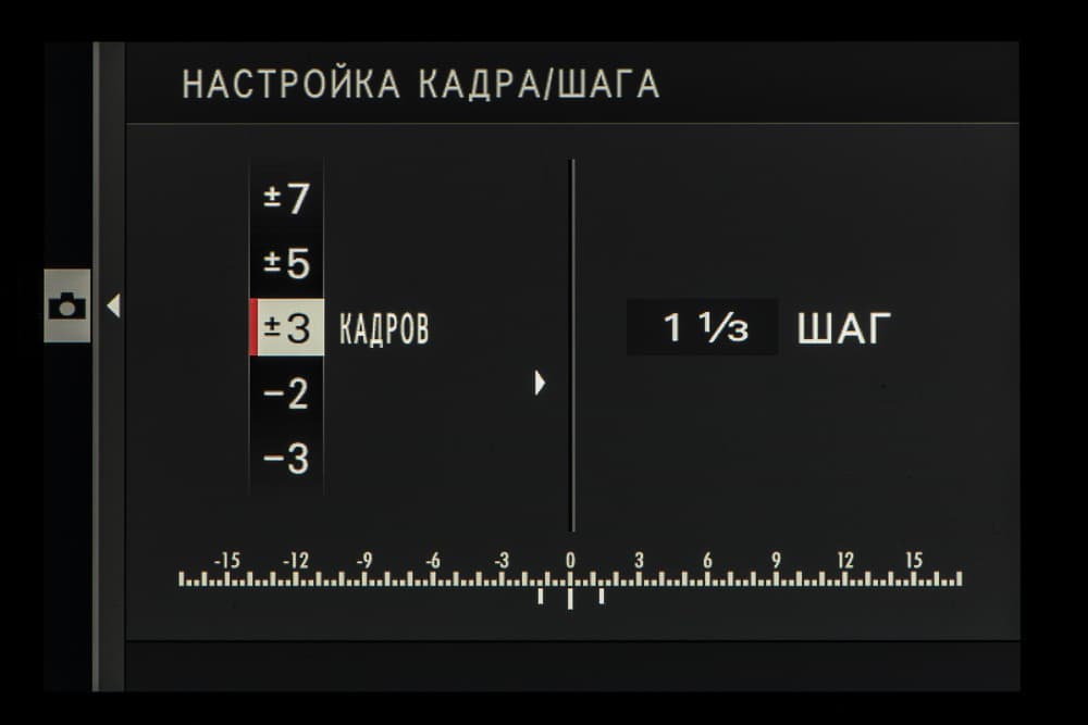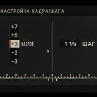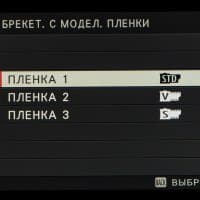 | Автобрэкетинг | по экспозиции: 2, 3, 5, 7, 9 кадров с шагом ⅓ (до ±3 EV); по моделируемым типам пленок: три любых типа; по динамическому диапазону: 100%, 200%, 400%; по ISO: ±⅓ EV, ±⅔ EV, ±1 EV; по балансу белого: ±1, ±2, ±3 майред; по зоне фокусировки: от 1 до 999 кадров, ступени от 1 до 10, интервал от 0 до 10 с |