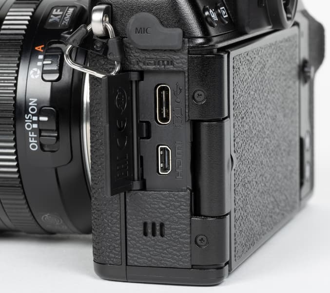 Обмен данными с компьютером, а также зарядка батареи внутри камеры осуществляются посредством интерфейса USB 3.2 Gen 1 (разъем Type C, верхний). Вывод изображения на внешнее устройство обеспечивает коннектор Micro-HDMI (Type D, нижний).