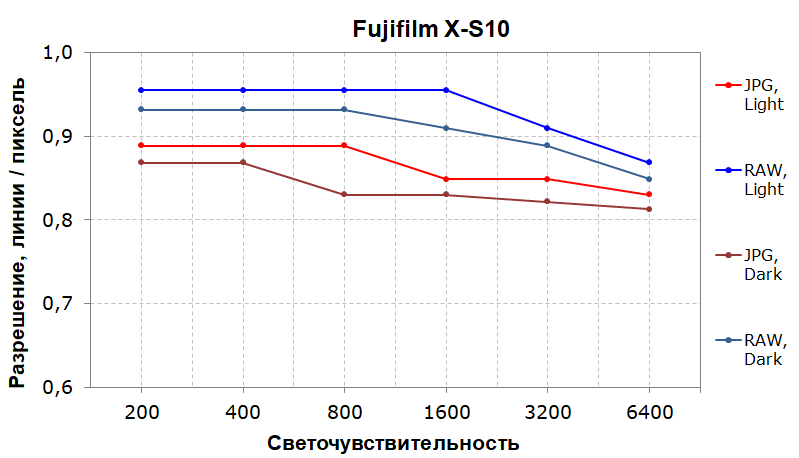 В расширенном диапазоне светочувствительности RAW и JPEG в светлой сцене на ISO 12800 выдают более 80%, а в темной — более 70%, что является хорошим результатом. При этом во всем диапазоне светочувствительности разрешение в светлой сцене не падает ниже 70%.