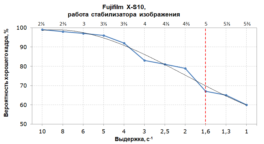 Производитель заявляет эффективность стабилизатора в 6 ступеней экспозиции. Наша методика позволяет оценить эффективность стабилизатора в 5 ступеней экспозиции с выходом годных 70%, что само по себе является довольно высоким результатом.