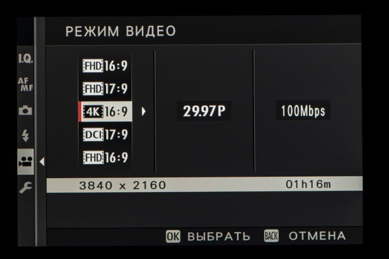 - Запись видео с максимальным разрешением DCI 4K (4096×2160) при 30 кадрах/с, поддержка F-Log