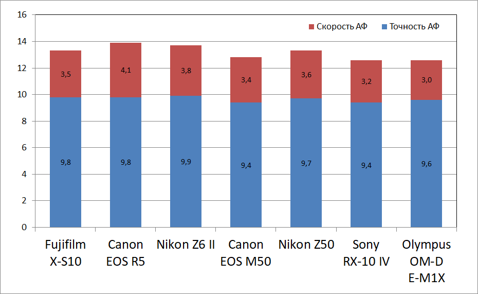 В общем зачете камера догоняет лидеров и находится на уровне Nikon Z50. К тому же, по обоим показателям она соответствует флагманской Fujifilm X-T4, которая на момент выхода была практически лидером.