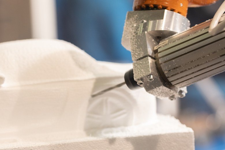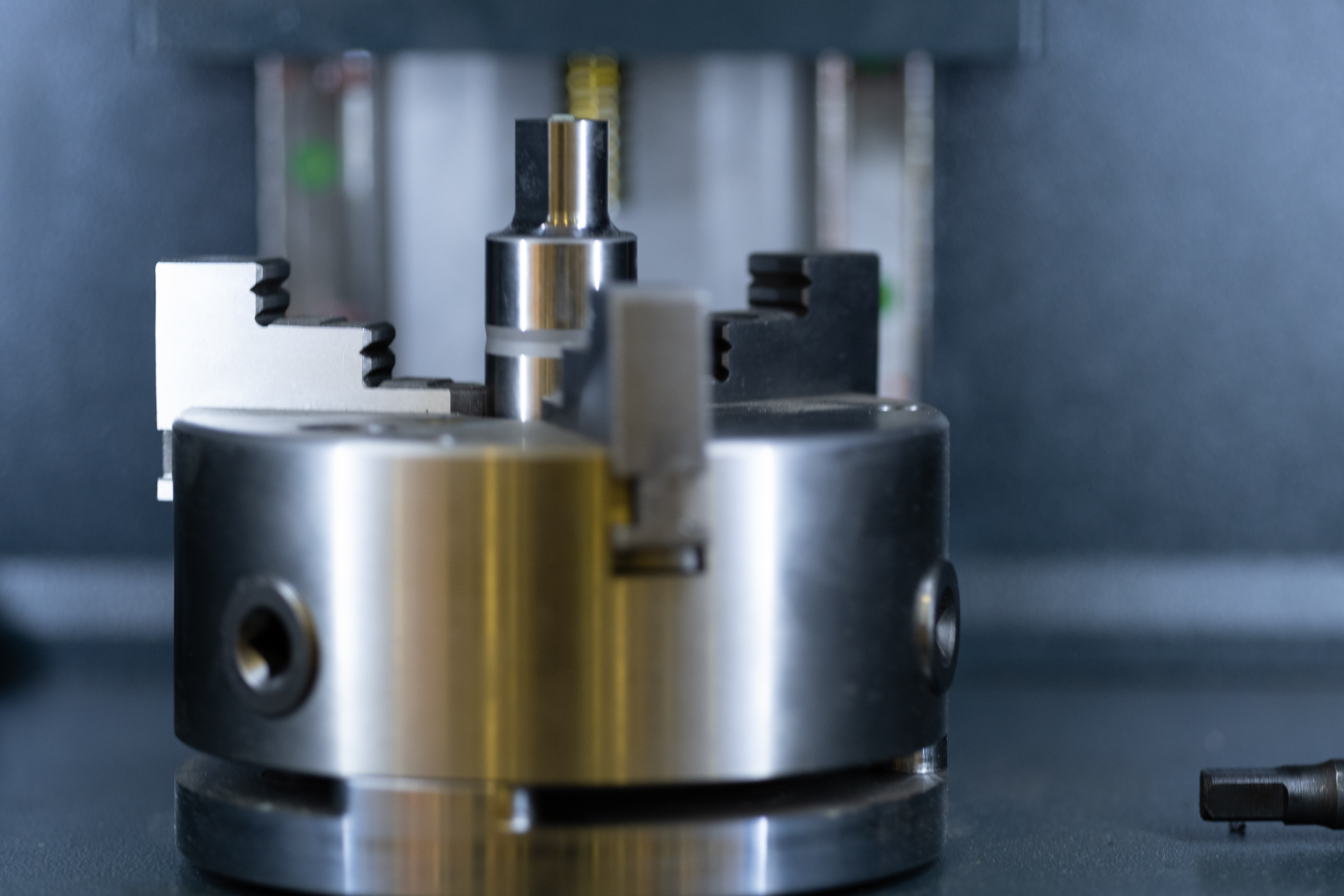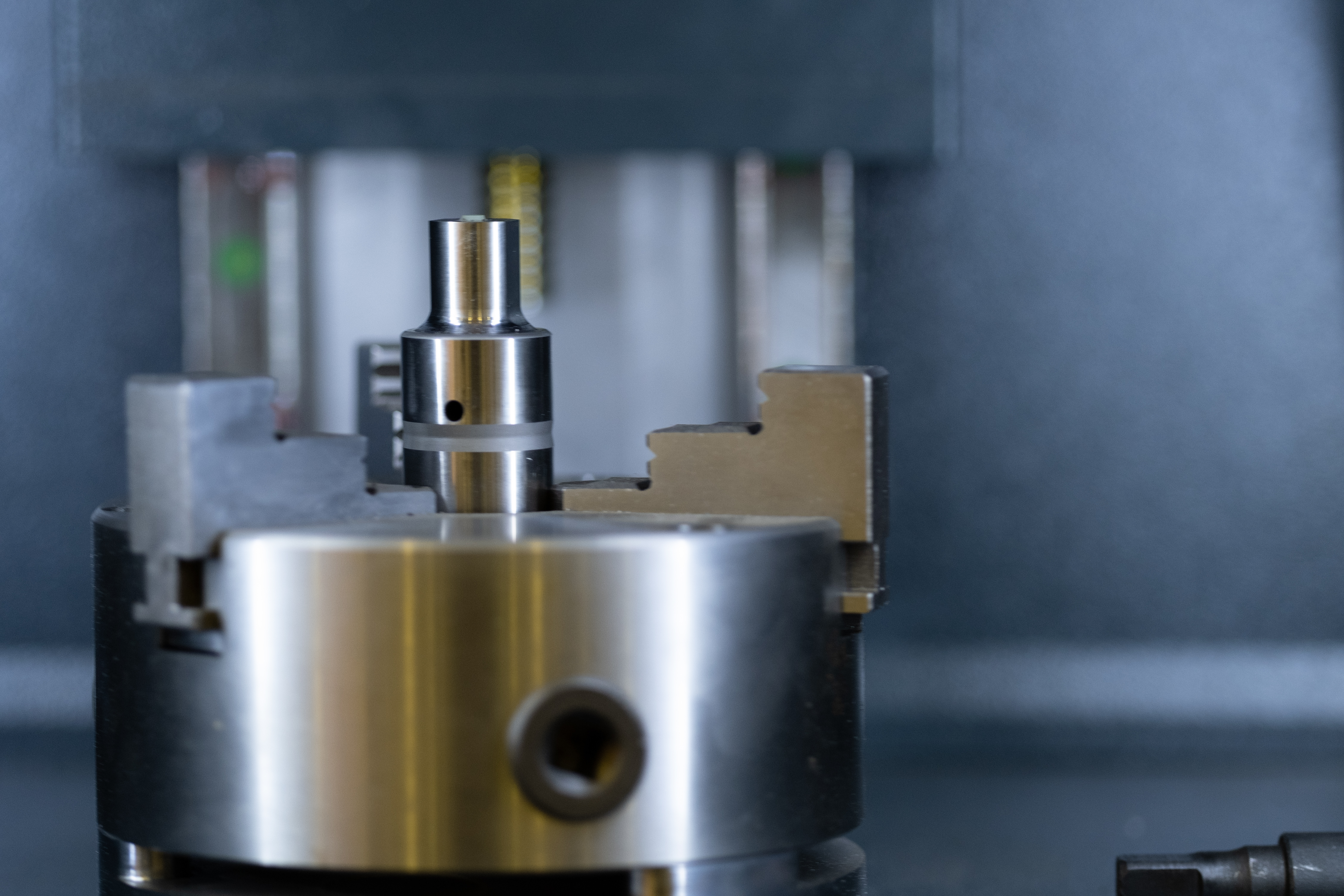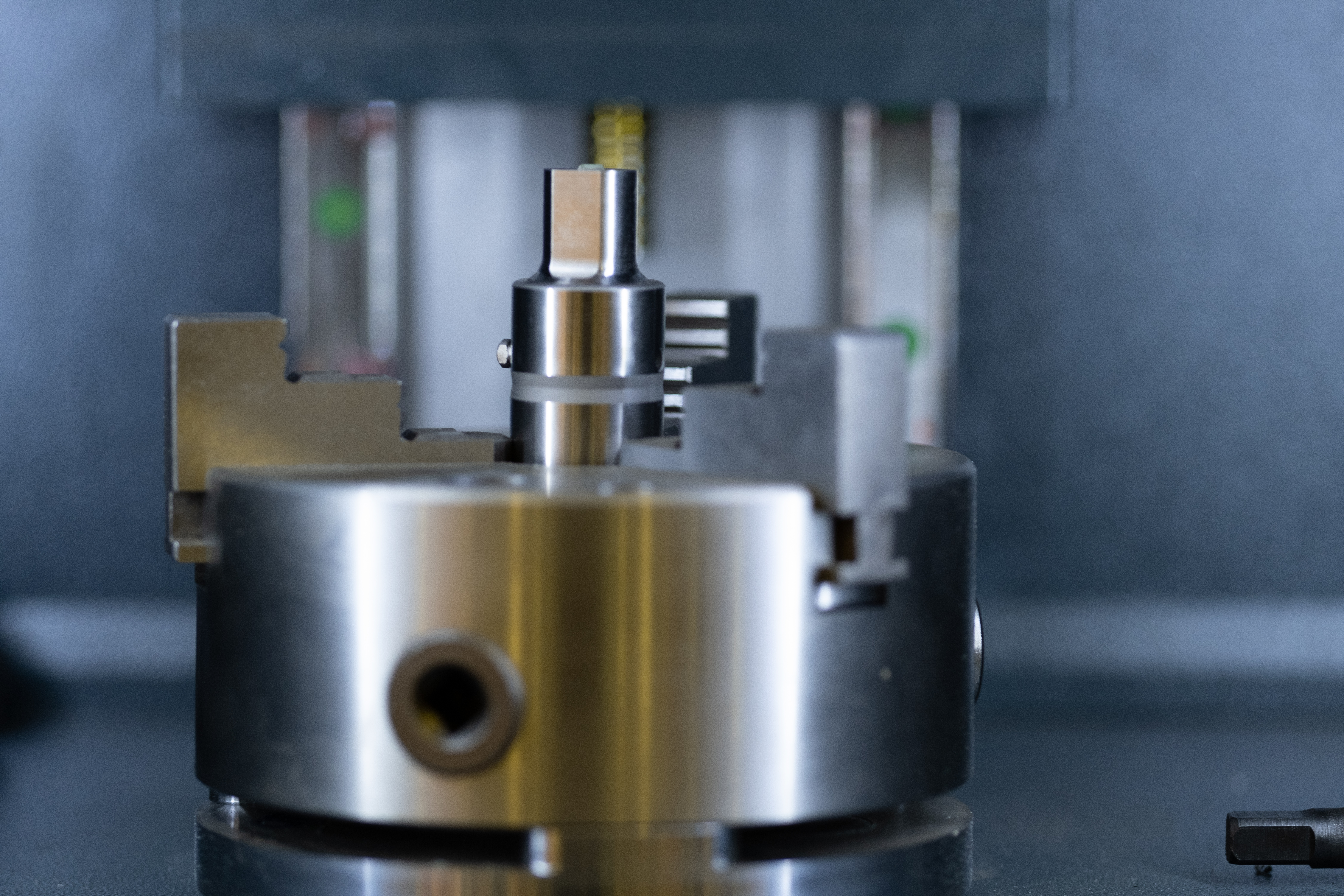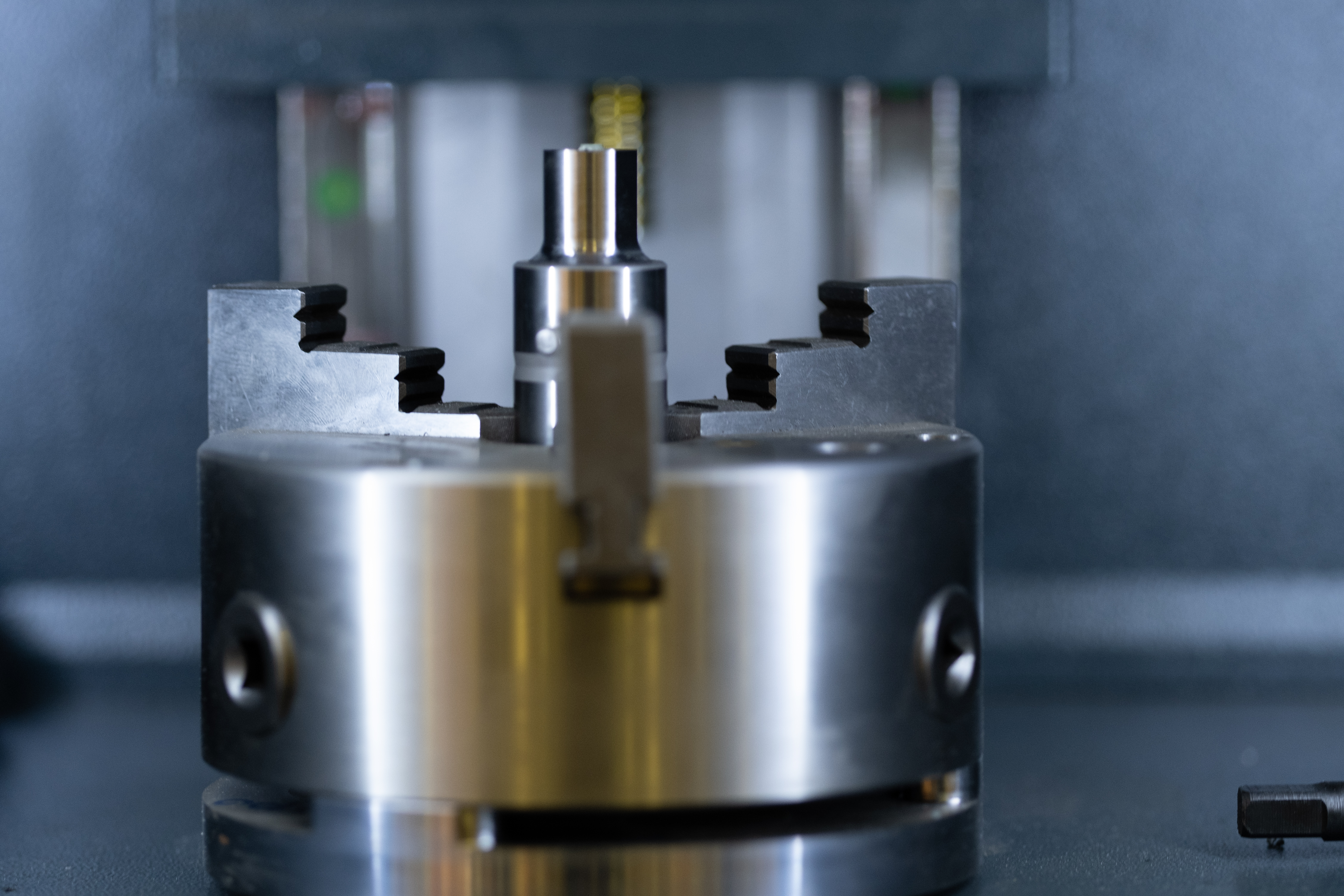 Съемка с использованием механического затвора без обрезки исходного изображения (размер кадра в пикселях — 6240×4160). Запись снимков одновременно в виде JPEG и RAW (RAF) без компрессии. Объектив Fujinon XF 90mm F2 R LM WR; F2; 1/140 c; ISO 800. Следящая автофокусировка по ближнему краю металлической заготовки, зажатой во вращающийся патрон станка. Дистанция до объекта — 0,6 м.