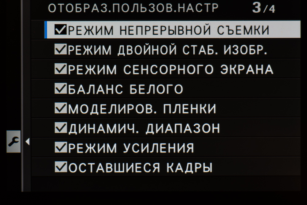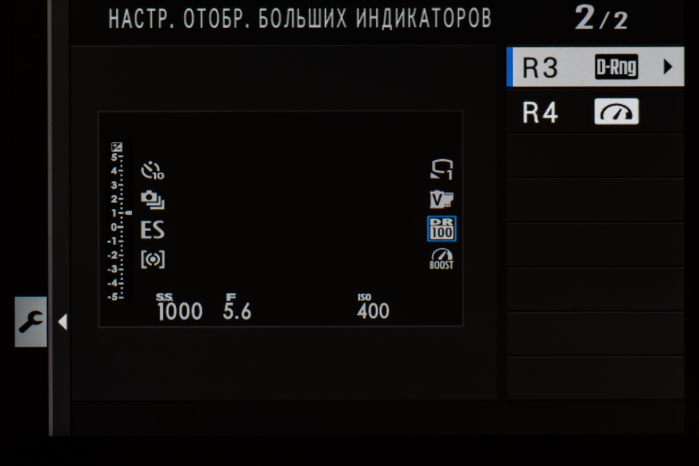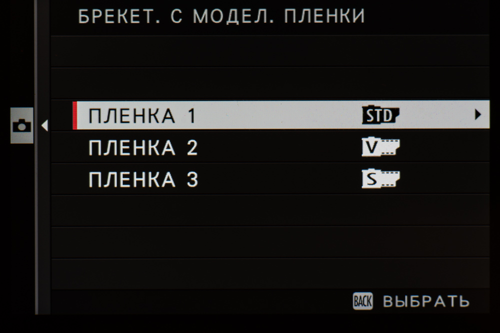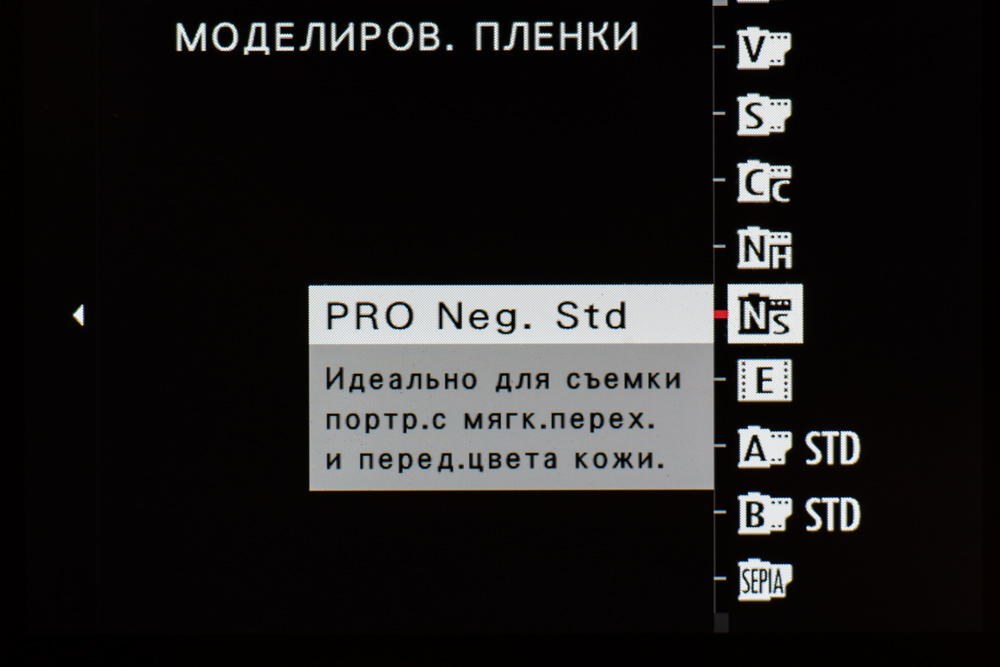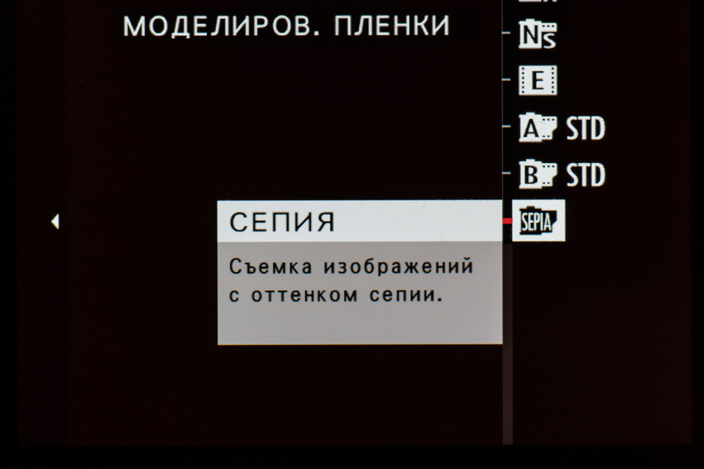 | Режимы имитации пленки | Provia (стандарт), Velvia (яркий), Astia (мягкий), Classic Chrome, Pro Neg.Hi, Pro Neg.Std, черно-белый, черно-белый с фильтрами (желтым, красным, зеленым), Sepia, Acros, Acros с фильтрами (желтым, красным, зеленым), Eterna (Cinema); эффекты зернистости и Color Chrome (сильный, слабый, выкл.) |