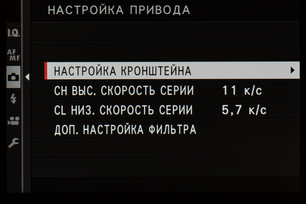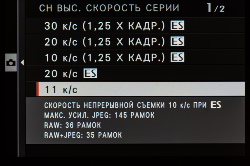 В таблице приведены значения средней скорости съемки для разных режимов. Первой скоростью назовем ту, с которой серийная съемка стартует. Ее предел — время, после которого съемка замедляется и продолжается со второй скоростью. Единицы измерения — кадры в секунду и секунды соответственно. Символ бесконечности означает, что при съемке ста кадров скорость не изменилась.