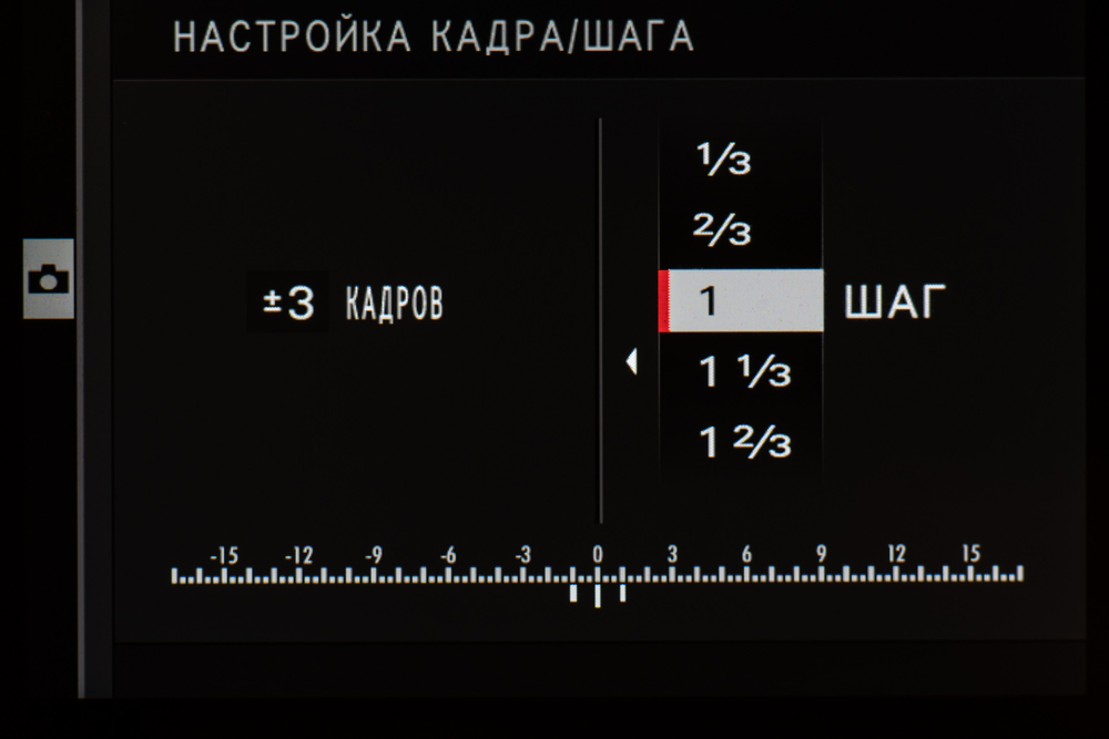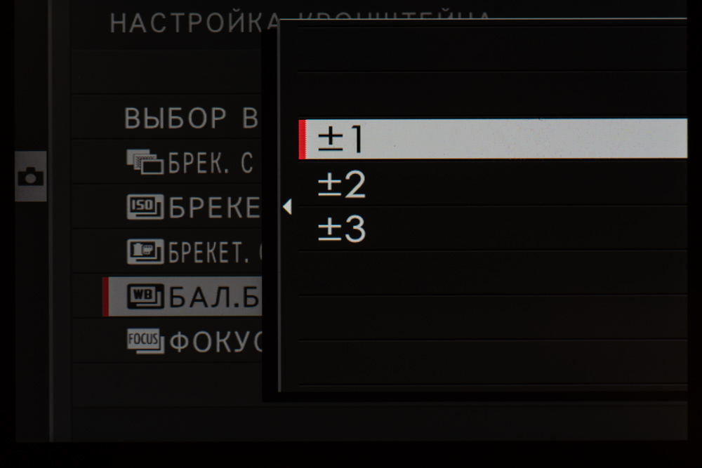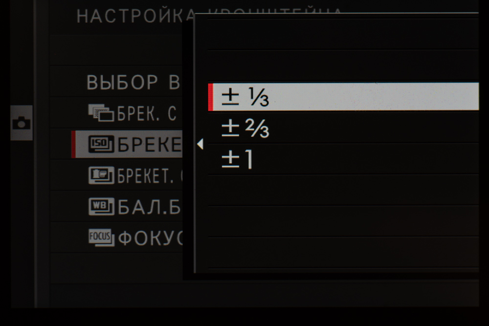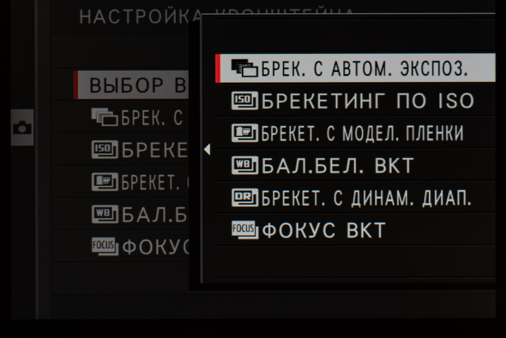 | Автобрекетинг | по экспозиции (кадры −2, −3, +3, +2, ±9, ±7, ±5, ±3; шаг 1/3 EV, 2/3 EV, 1 EV, 4/3 EV, 5/3 EV, 2 EV, 7/3 EV, 8/3 EV, 3 EV), по типу пленки (3 типа на выбор), по динамическому диапазону (100%, 200%, 400%), по ISO (±⅓ EV, ±⅔ EV, ±1 EV), по балансу белого (±1, ±2, ±3), по дистанции фокусировки (кадры 1—999; шаг 1—10, интервал 0—10 с) |
