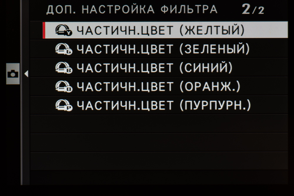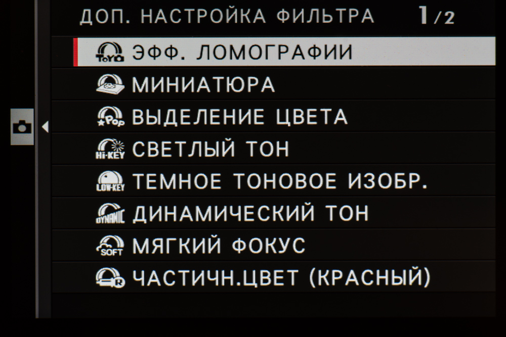 | Эффекты изображения | Toy camera, Miniature, Pop color, High-key, Low-key, Dynamic tone, Soft focus, Partial color (красный/оранжевый/желтый/зеленый/синий/фиолетовый) |