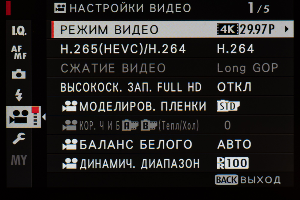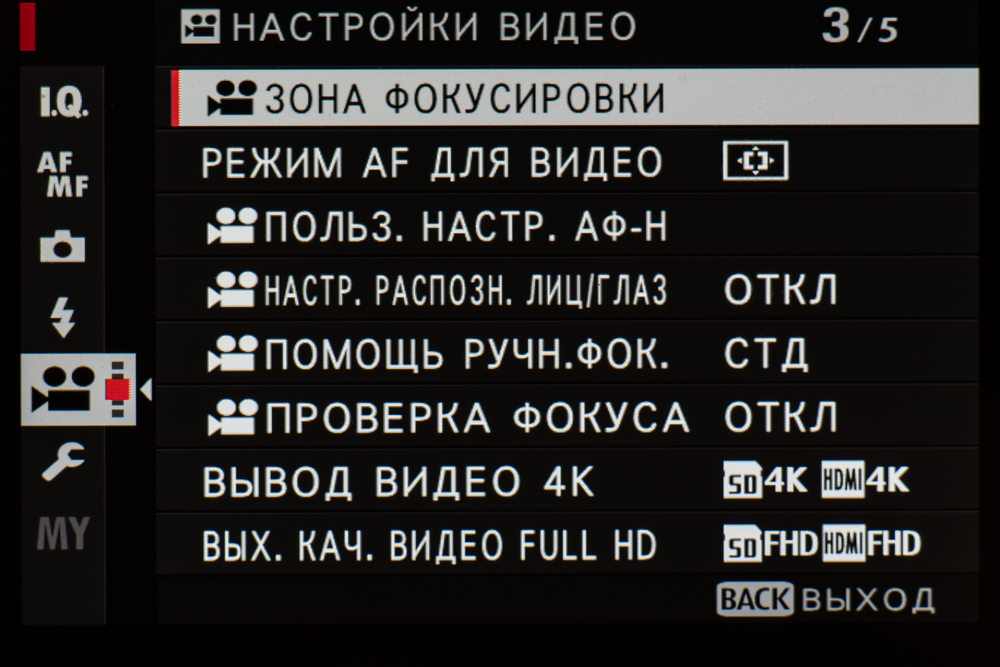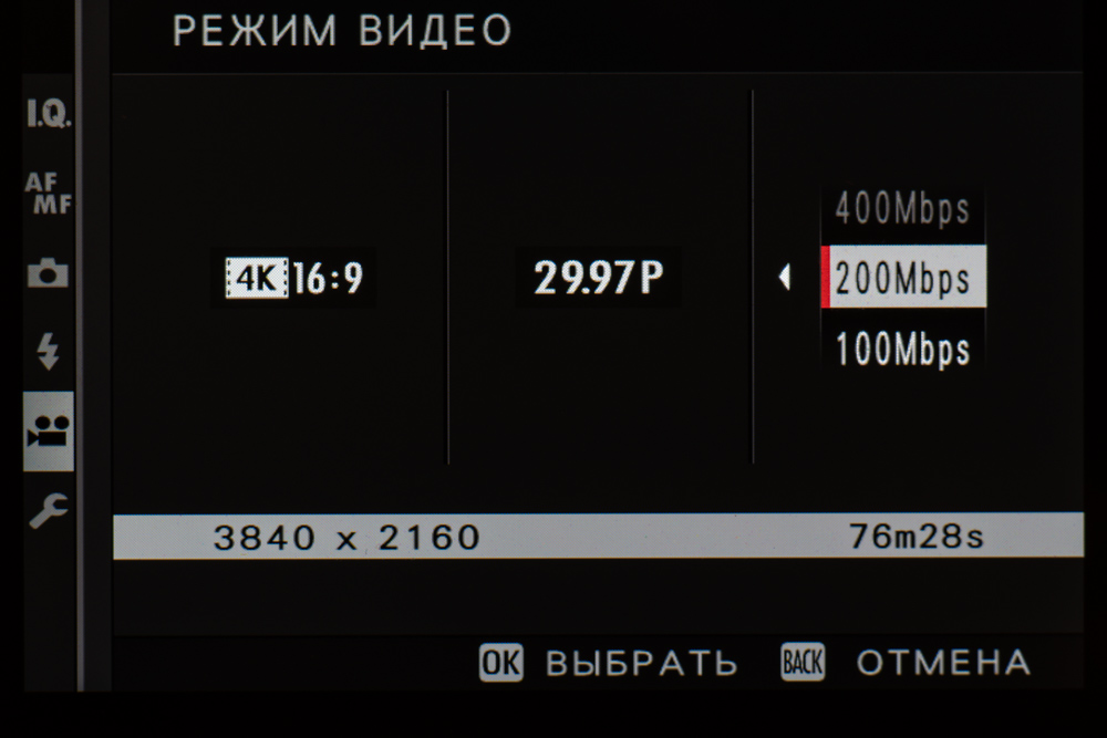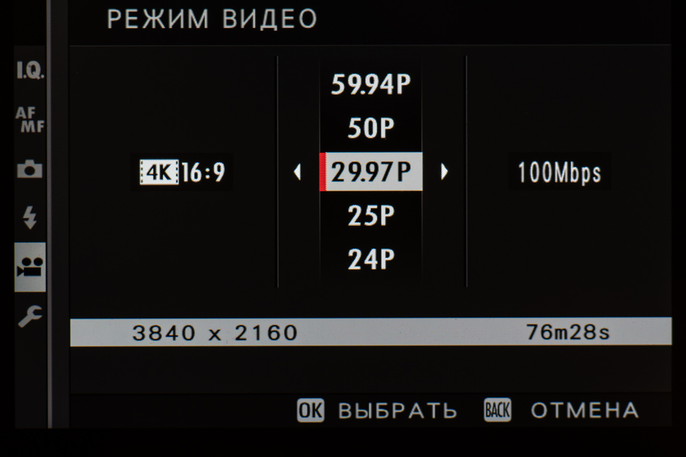 Видеозапись поддерживает 10-битное кодирование цвета (4:2:0) и сохранение профиля F-Log с целью выравнивания контрастов и резервирования широкого тонального диапазона для последующей обработки в видеоредакторе. Длительность съемки клипа в 4K составляет 30 минут — это втрое дольше, чем позволяет записать Fujifilm X-T2.