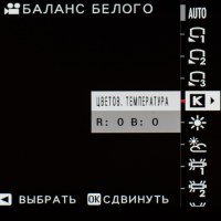 | Баланс белого | авто, пользовательские установки (3), прямая установка цветовой температуры (2500—10000 K), предварительные установки (солнечный свет, тень, люминесцентная лампа (дневного света, теплый и холодный белый), лампа накаливания, под водой |