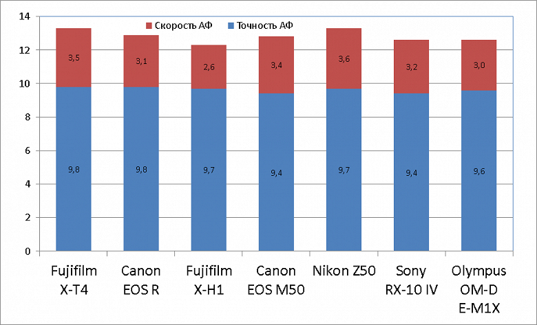 В общем зачете по автофокусировке камера находится на первом месте нашего рейтинга, примерно наравне с Nikon Z50. По точности автофокуса Fujifilm X-T4 находится практически на уровне профессиональных камер (Canon EOS R), а по скорости даже превосходит их. Конечно, в сравнении с полнокадровыми аппаратами сенсор APS-C позволяет получить небольшой выигрыш, но все равно: на данный момент Fujifilm X-T4 показывает рекордные результаты среди камер с сенсорами APS-C (и не только среди них).