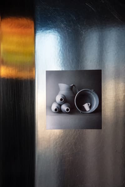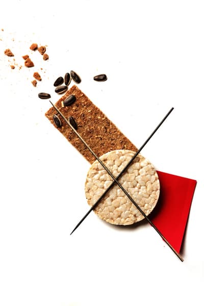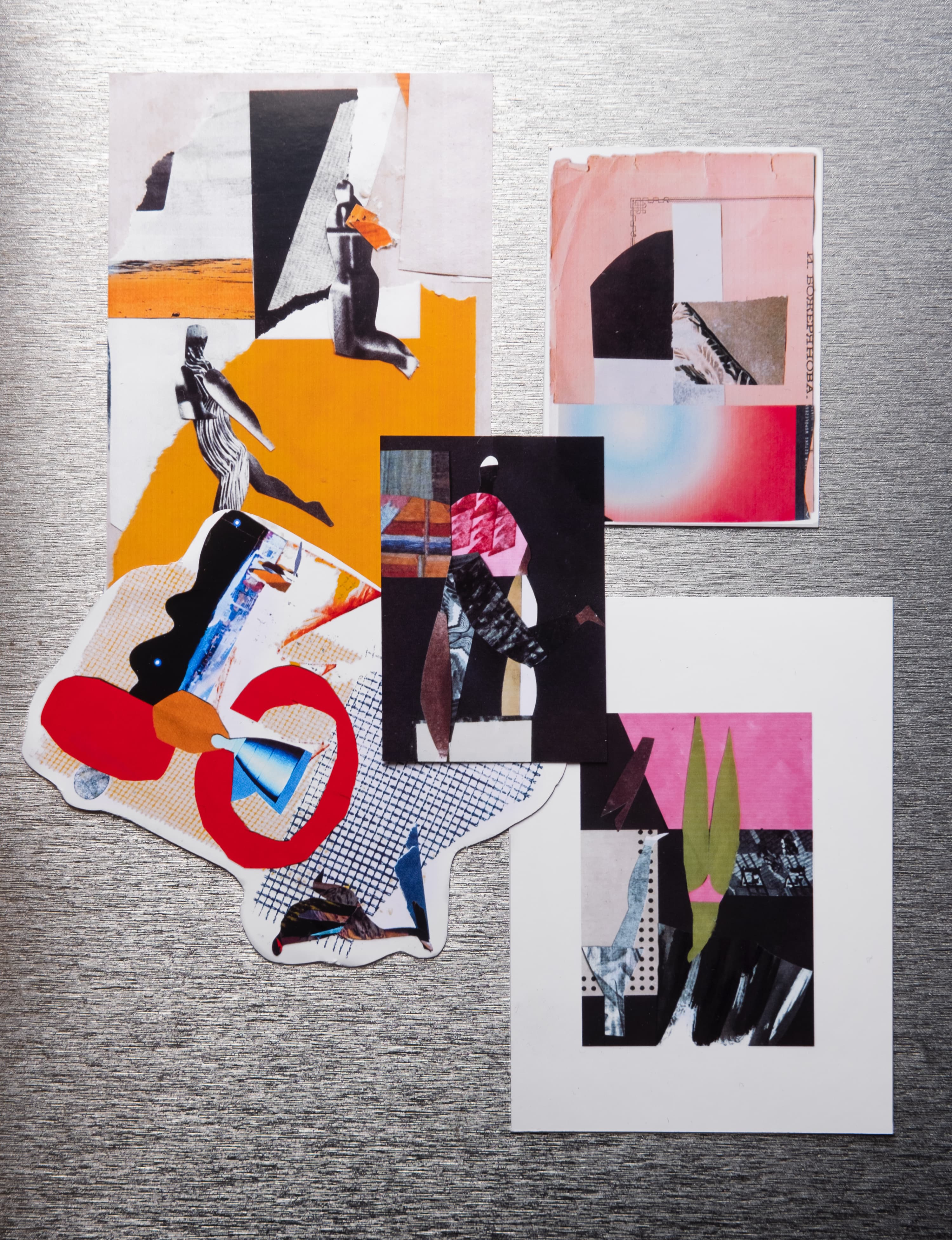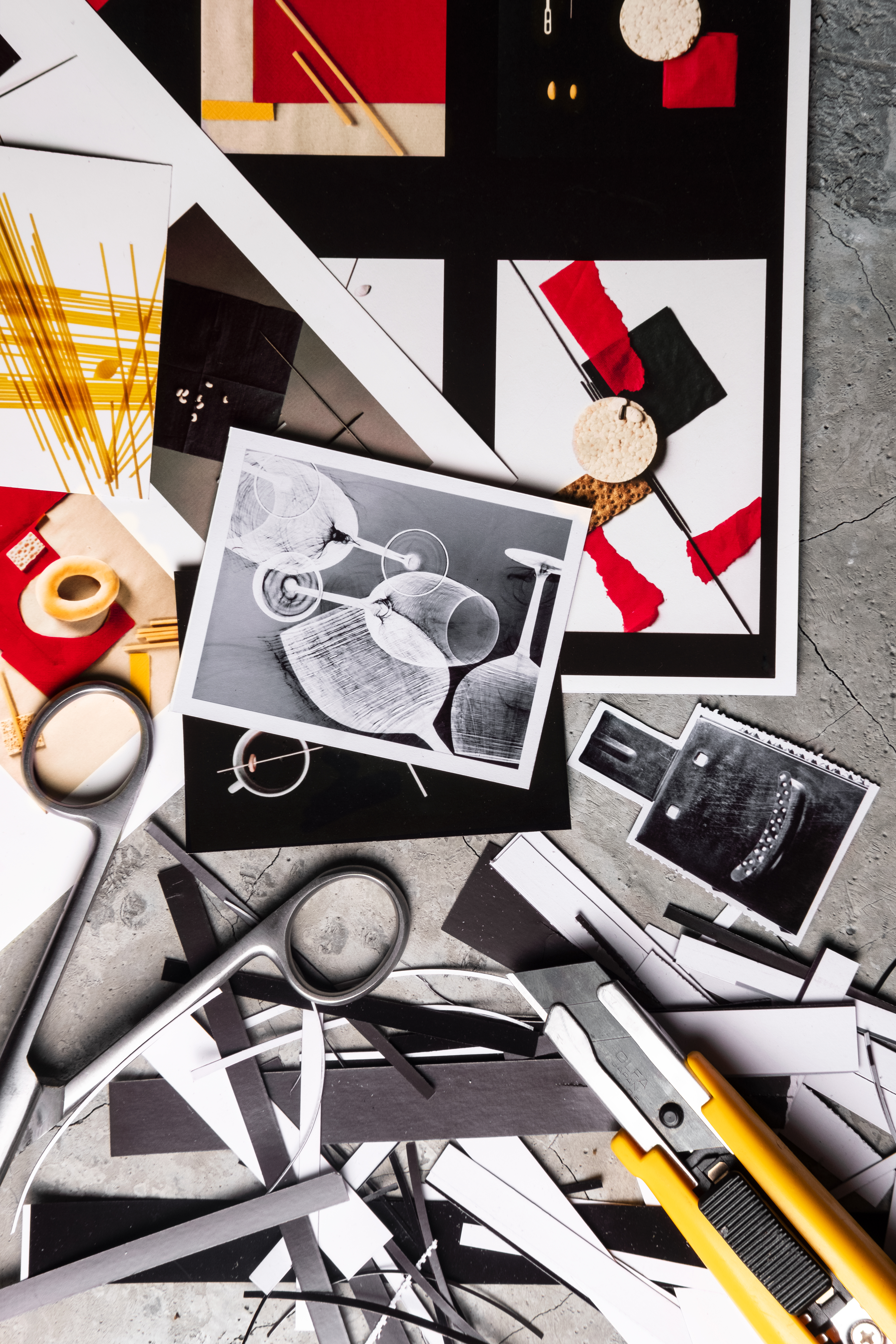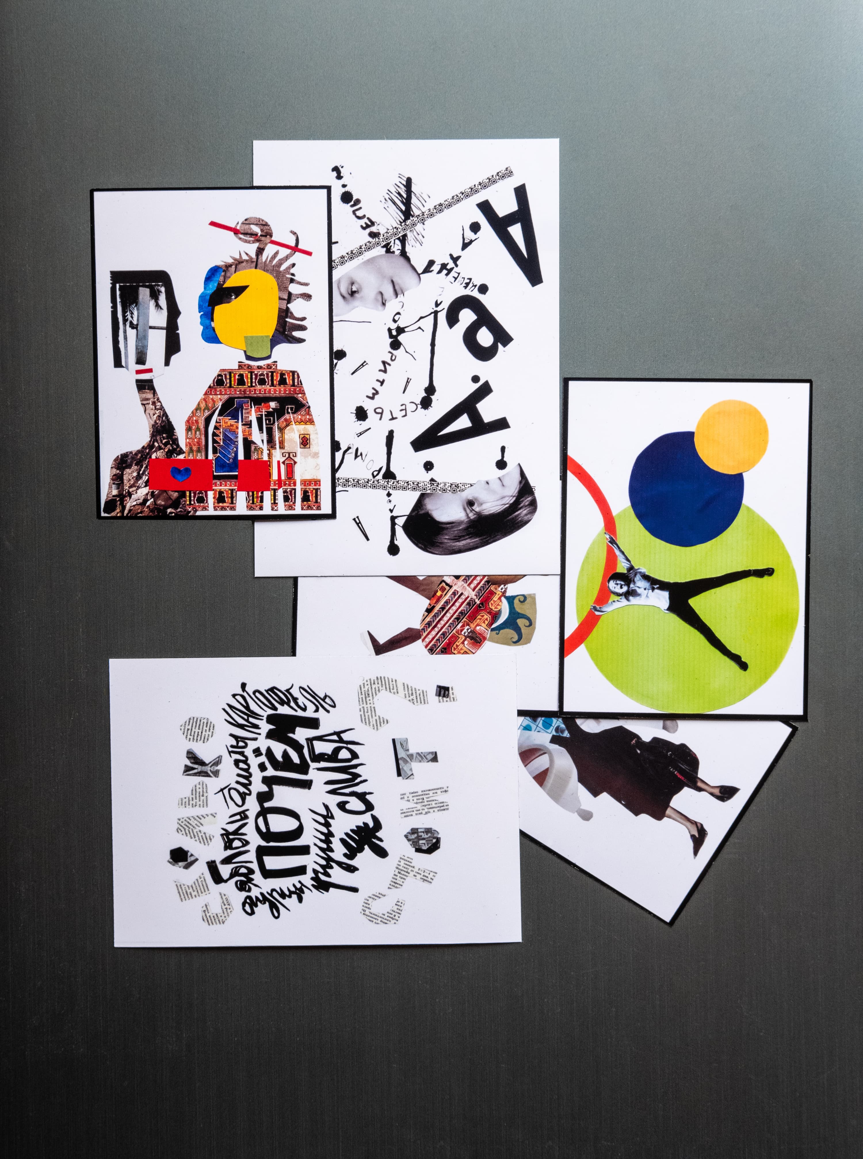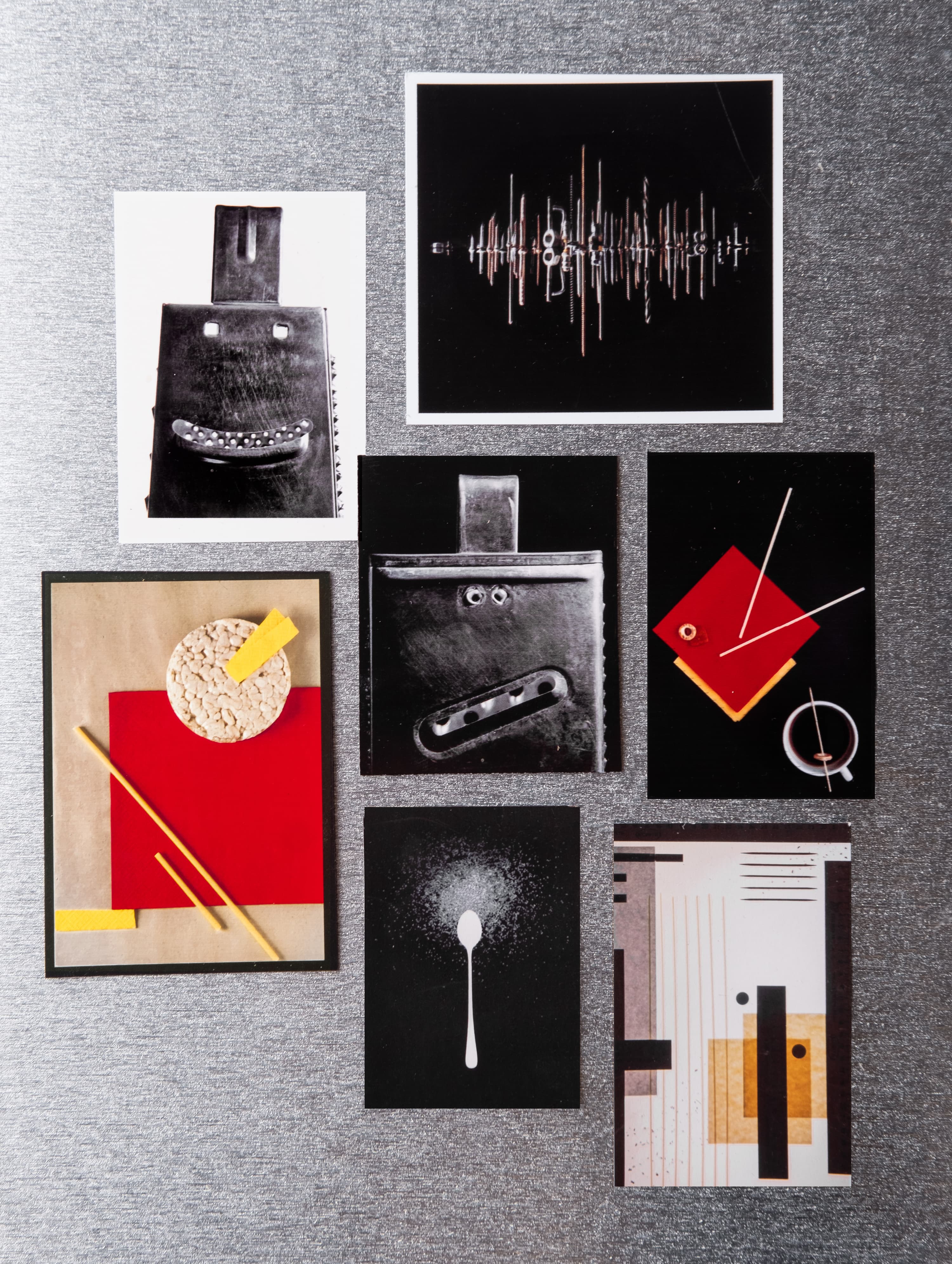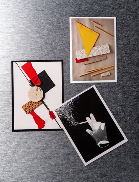 На мой взгляд, для печати в маленьком формате лучше всего подходят контрастные, яркие изображения — скорее графика, чем фотография. Поэтому я выбрала серию работ «Сушечный супрематизм», которые мы снимали с моими учениками, выкладывая абстрактные композиции из сушек, сухарей, макарон, салфеток и т. д. Также я попробовала напечатать свои минималистичные натюрморты и коллажи художника Анны Журко. Шрифтовая графика тоже отлично выглядит в небольшом формате.