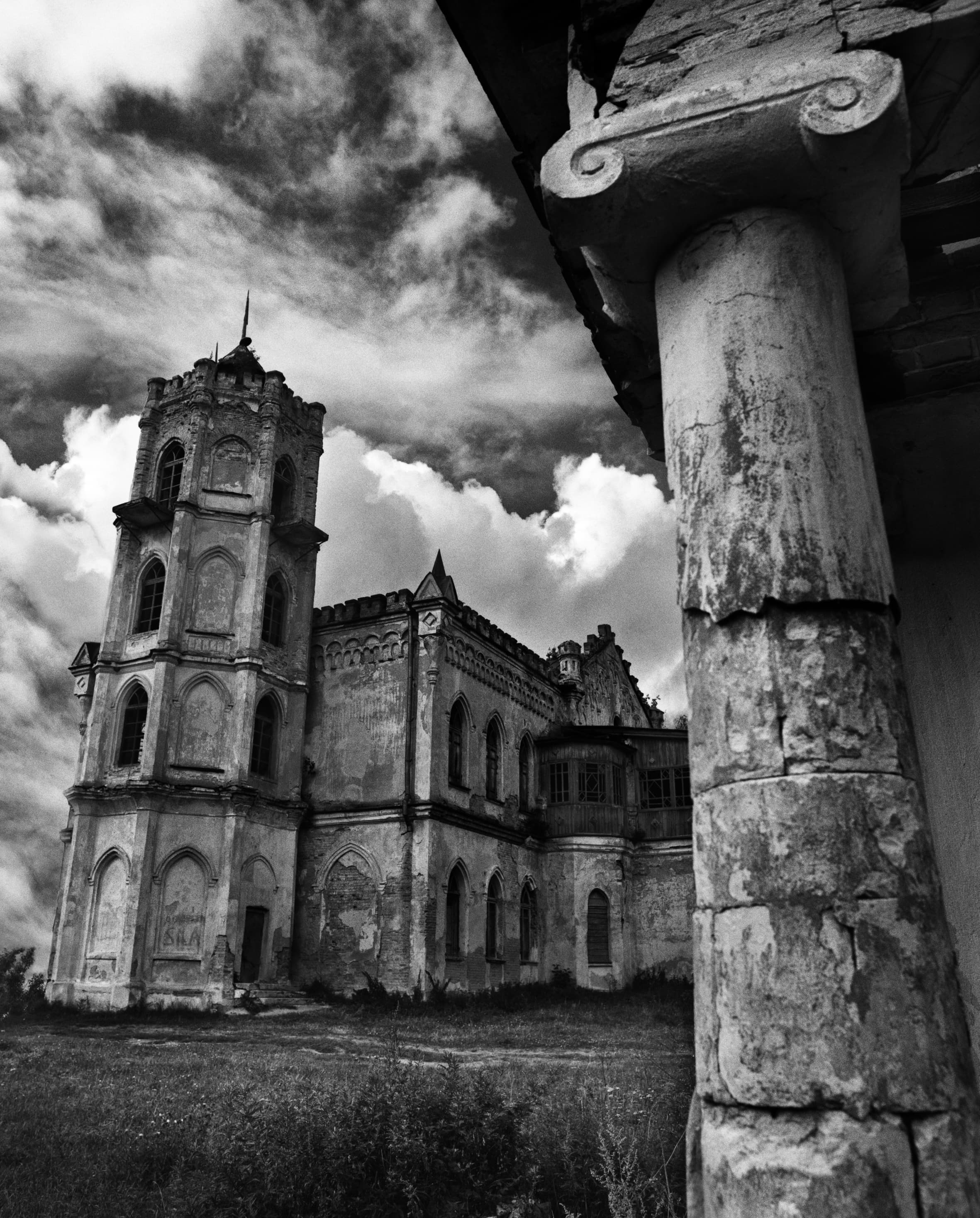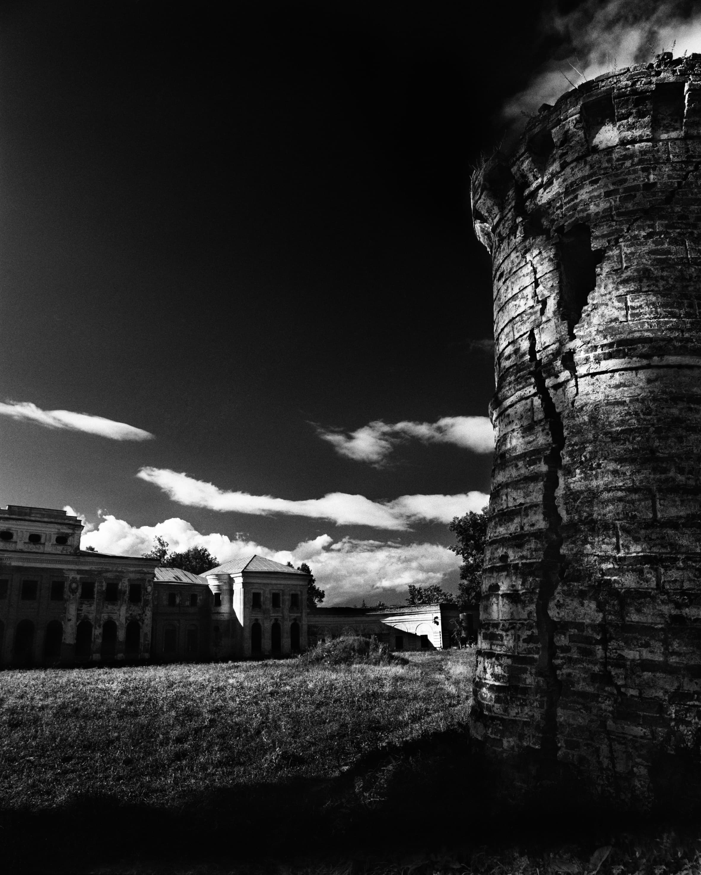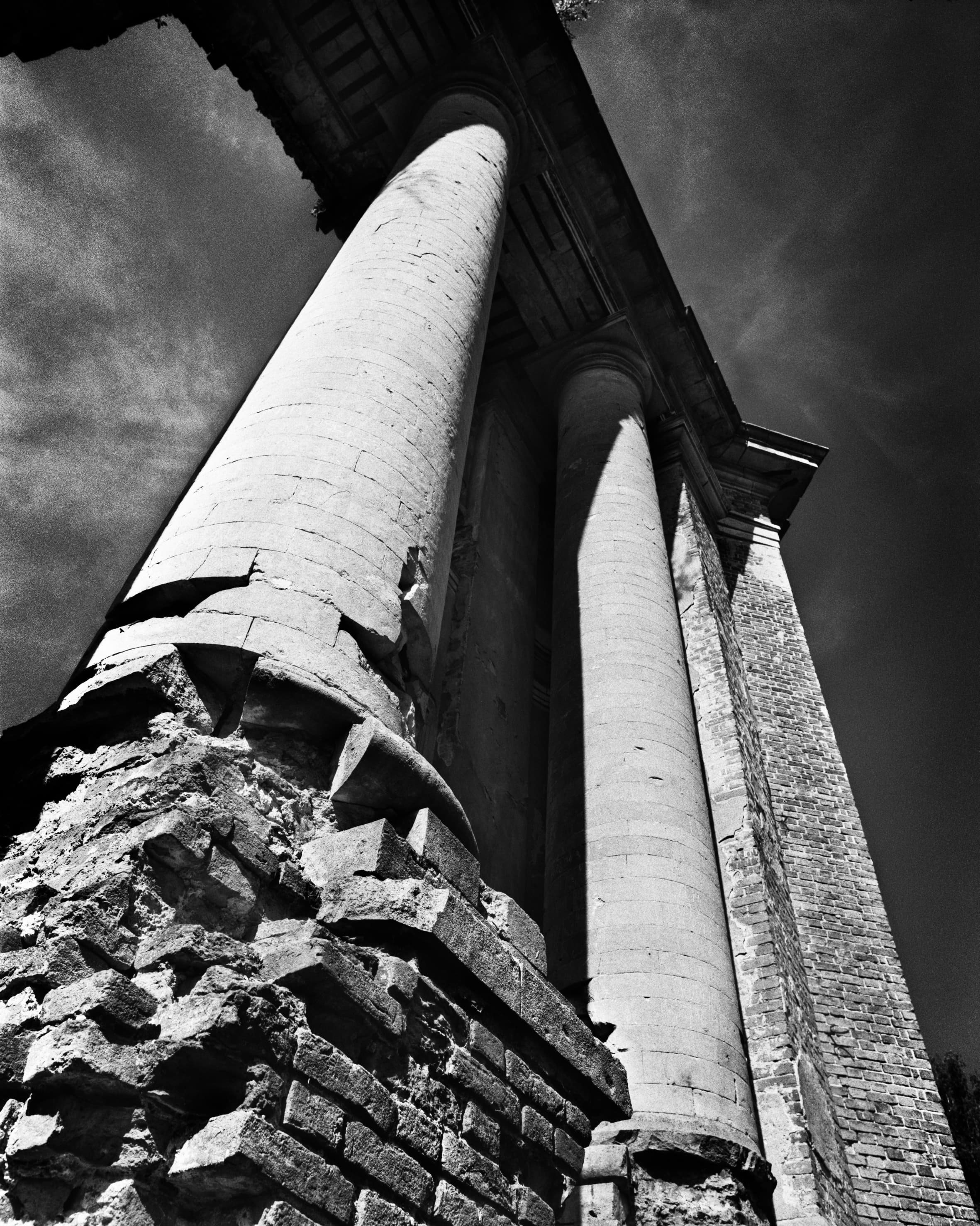 Мы с моим помощником Максимом Серегиным ездили по всему Подмосковью, снимая разрушенные храмы и усадьбы. Продумывая общую стилистику этого проекта, я решила снимать его на черно-белую пленку, усиливая контраст при помощи фильтров и проявки. В целом серия визуально основана на подчеркнутой фактуре разрушающихся зданий и архитектурных фрагментов. Поэтому фактурность самой бумаги при печати этого проекта не смотрится чем-то чужеродным.