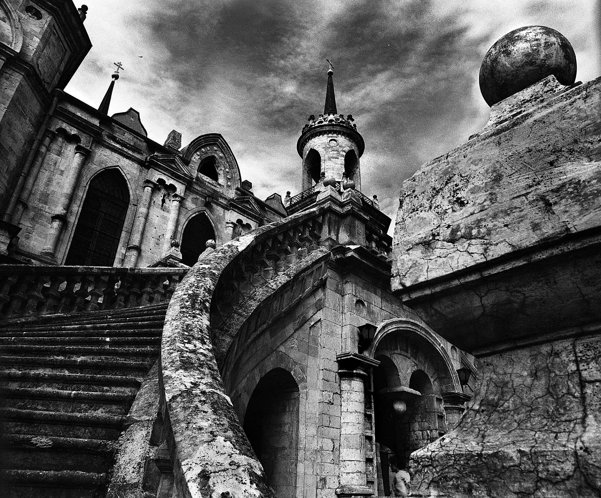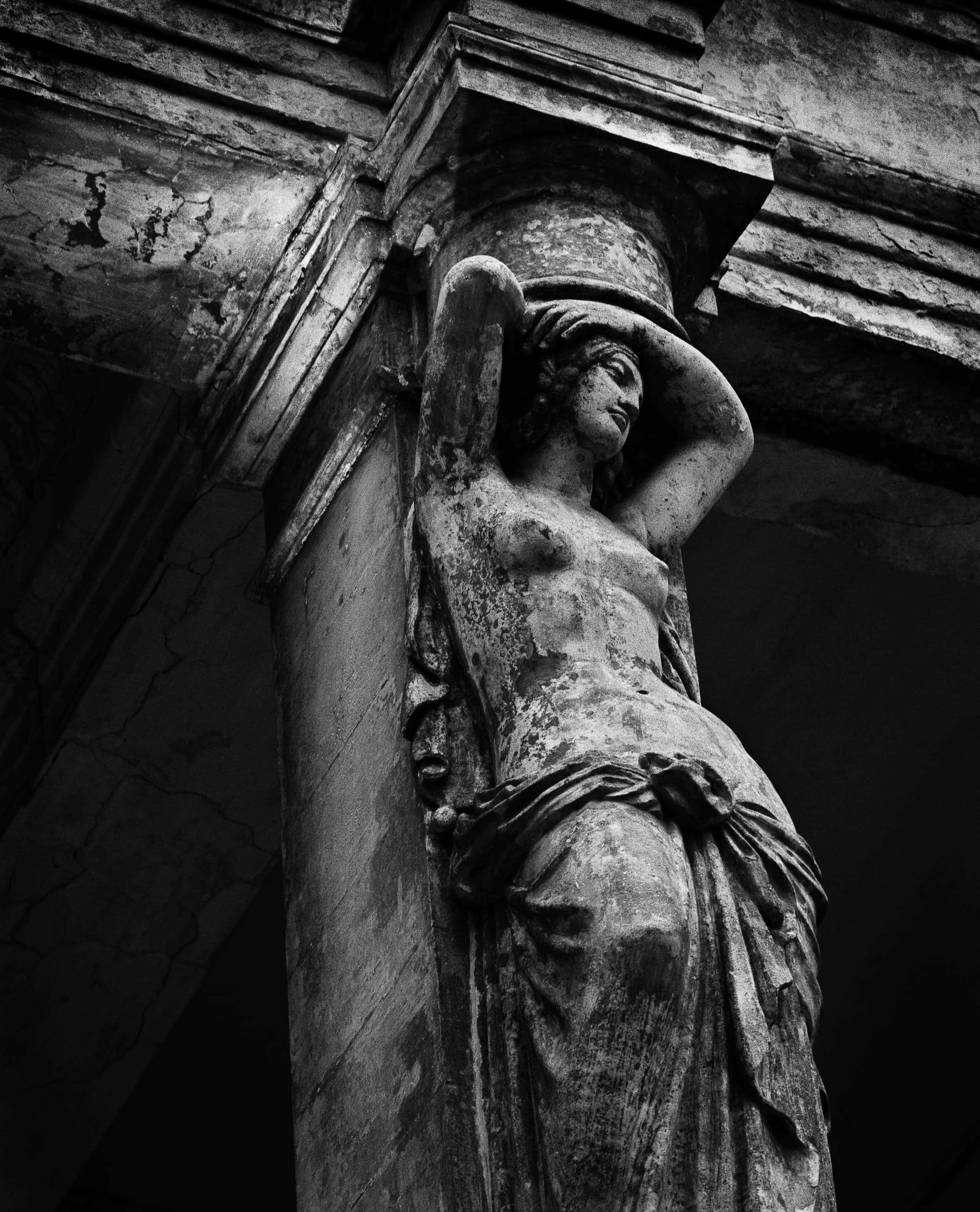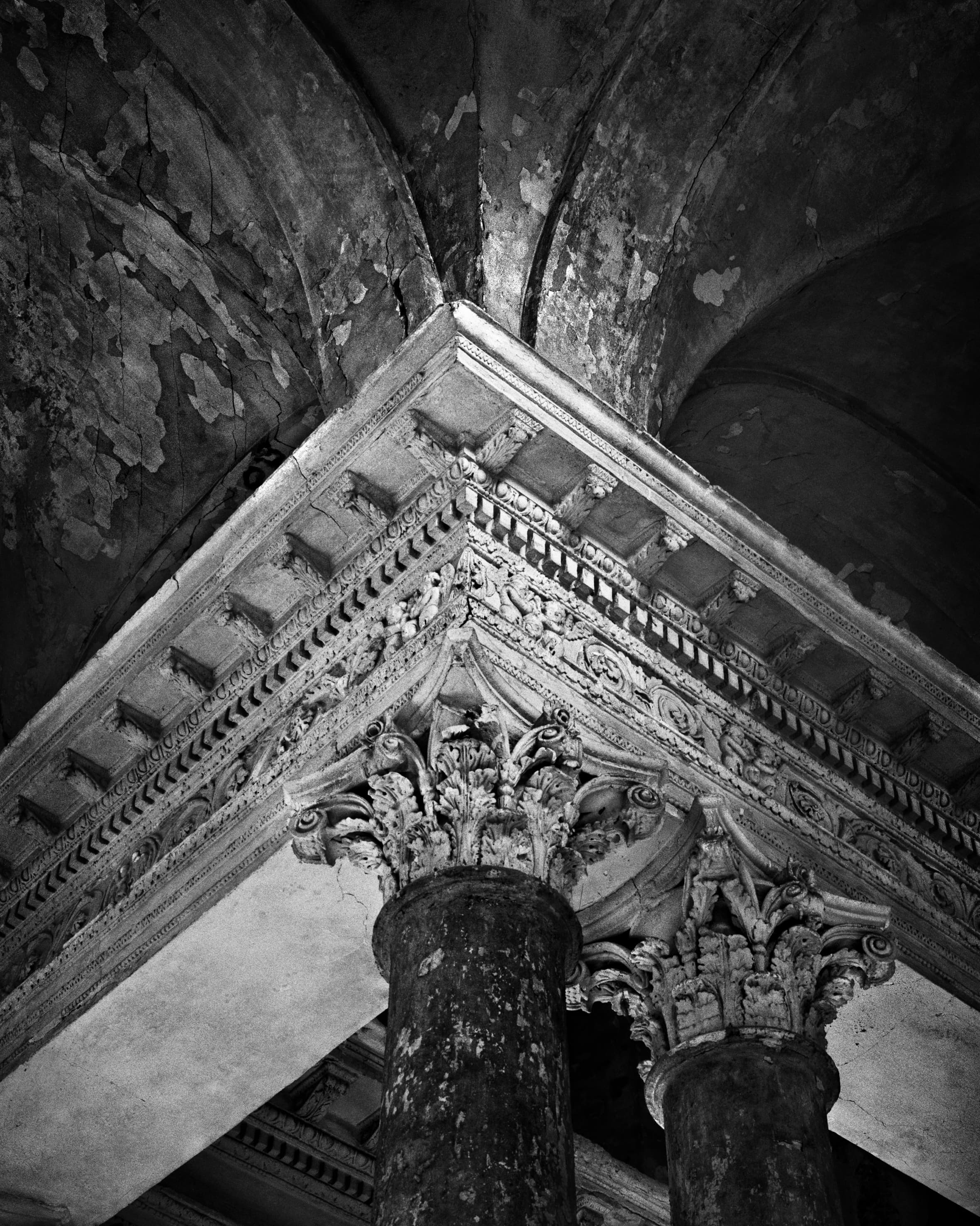 Мы с моим помощником Максимом Серегиным ездили по всему Подмосковью, снимая разрушенные храмы и усадьбы. Продумывая общую стилистику этого проекта, я решила снимать его на черно-белую пленку, усиливая контраст при помощи фильтров и проявки. В целом серия визуально основана на подчеркнутой фактуре разрушающихся зданий и архитектурных фрагментов. Поэтому фактурность самой бумаги при печати этого проекта не смотрится чем-то чужеродным.