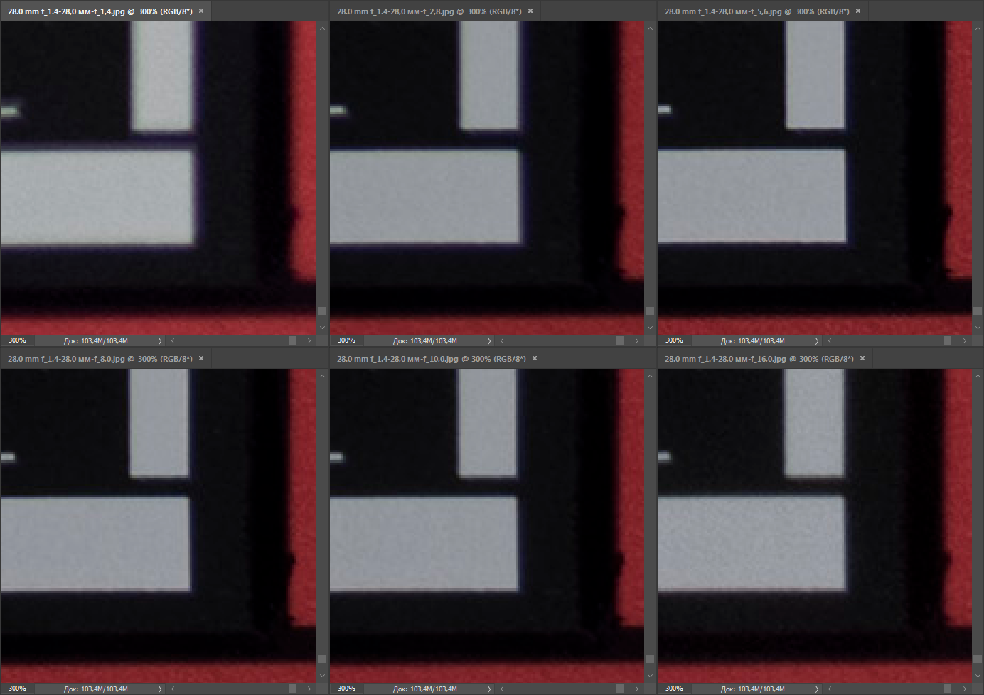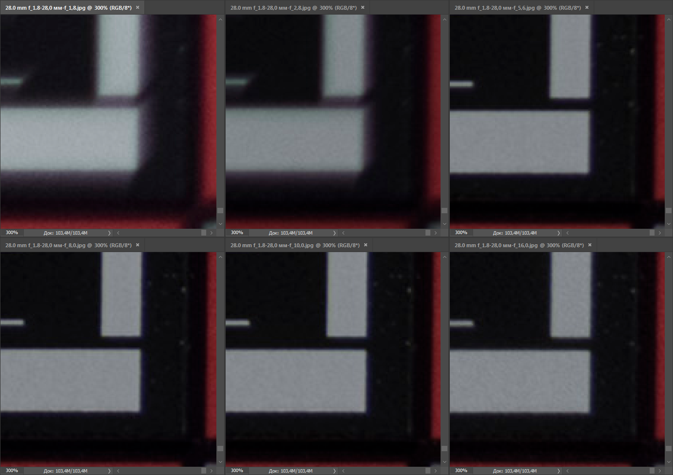 В этой серии превосходство Nikon AF-S Nikkor 28mm F1.4E ED над Nikon AF-S Nikkor 28mm F1.8G более заметно. По резкости в центре второй догоняет первого при F4, на периферии — при F5,6. Хроматические аберрации у более «продвинутого» конкурента нивелируются уже при F4, а у более скромного — только при F8.