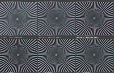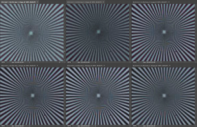 Приведем ниже графики частотно-контрастной характеристики, или MTF, по данным производителя при максимальном раскрытии объективов. Красным цветом выделены кривые для разрешения 10 линий/мм, синим — 30 линий/мм; сплошные линии — для сагиттальных структур, пунктирные — для меридиональных. Напомним, что в идеале кривые MTF должны быть параллельны горизонтальной оси, не иметь изгибов (подъемов и завалов) и располагаться как можно выше (к единице по оси ординат).