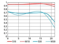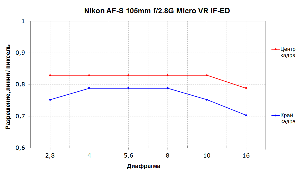 Объектив демонстрирует высокую и стабильную разрешающую способность на всем диапазоне диафрагмирования. Примечательно, что и на f/2.8, и на f/10 линза отрабатывает примерно на 83%. При этом край кадра несущественно отстает от центра, держится практически на уровне 80%.