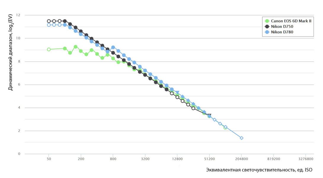 На графике зеленым маркирован Canon EOS 6D, черным — Nikon D750, голубым — Nikon D780. Незаполненные фигуры демонстрируют показатели ДД за пределами рабочих значений ISO (то есть в расширенном диапазоне). Треугольники, расположенные вершиной вверх, означают показатели при масштабировании, вершиной вниз — включенное шумоподавление, ромбы — и то, и другое.