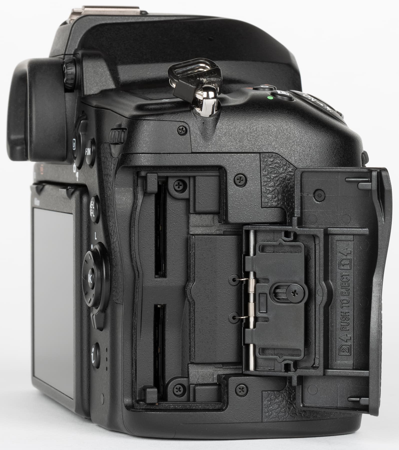 Камера располагает двумя слотами для карт памяти SD/SDHC/SDXC; оба поддерживают высокоскоростной стандарт UHS-II.