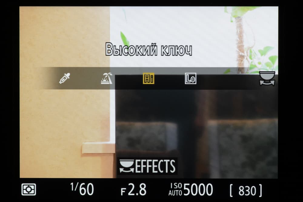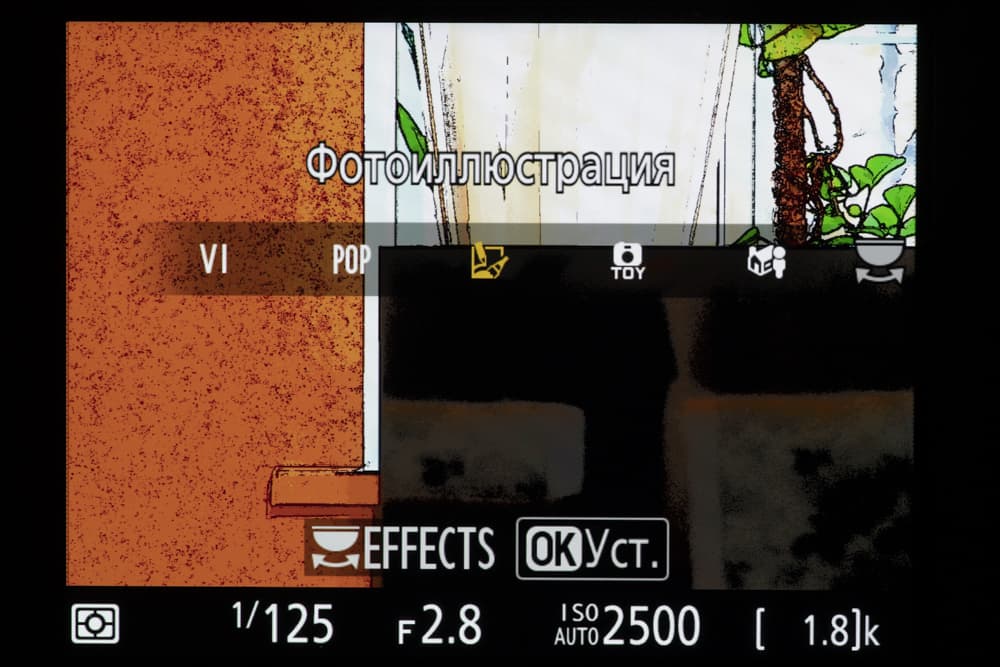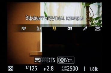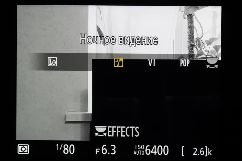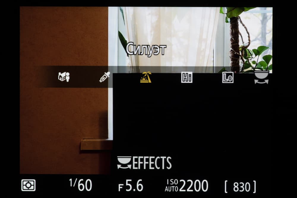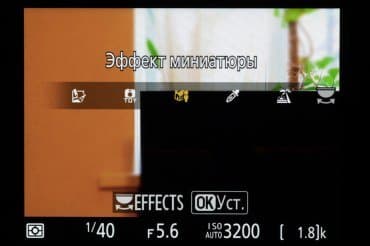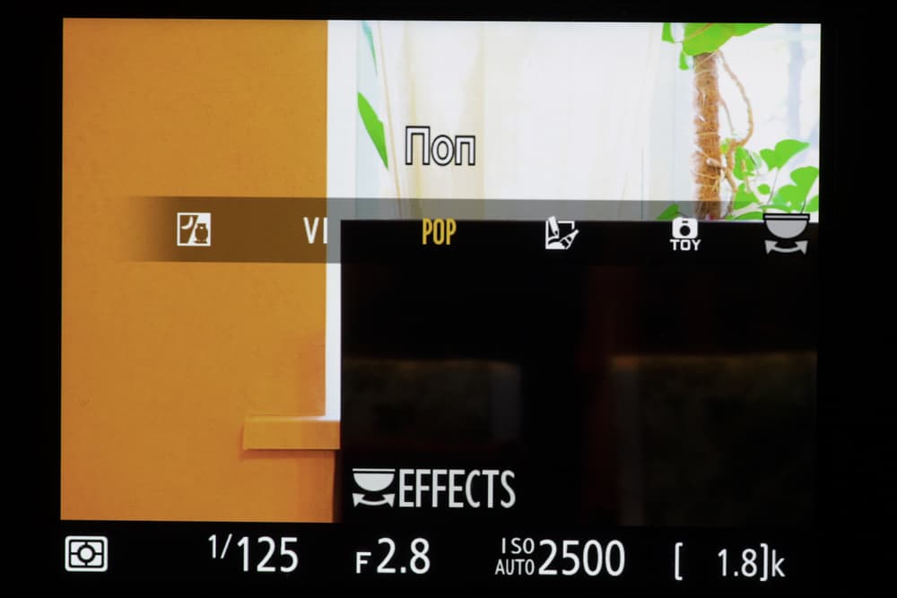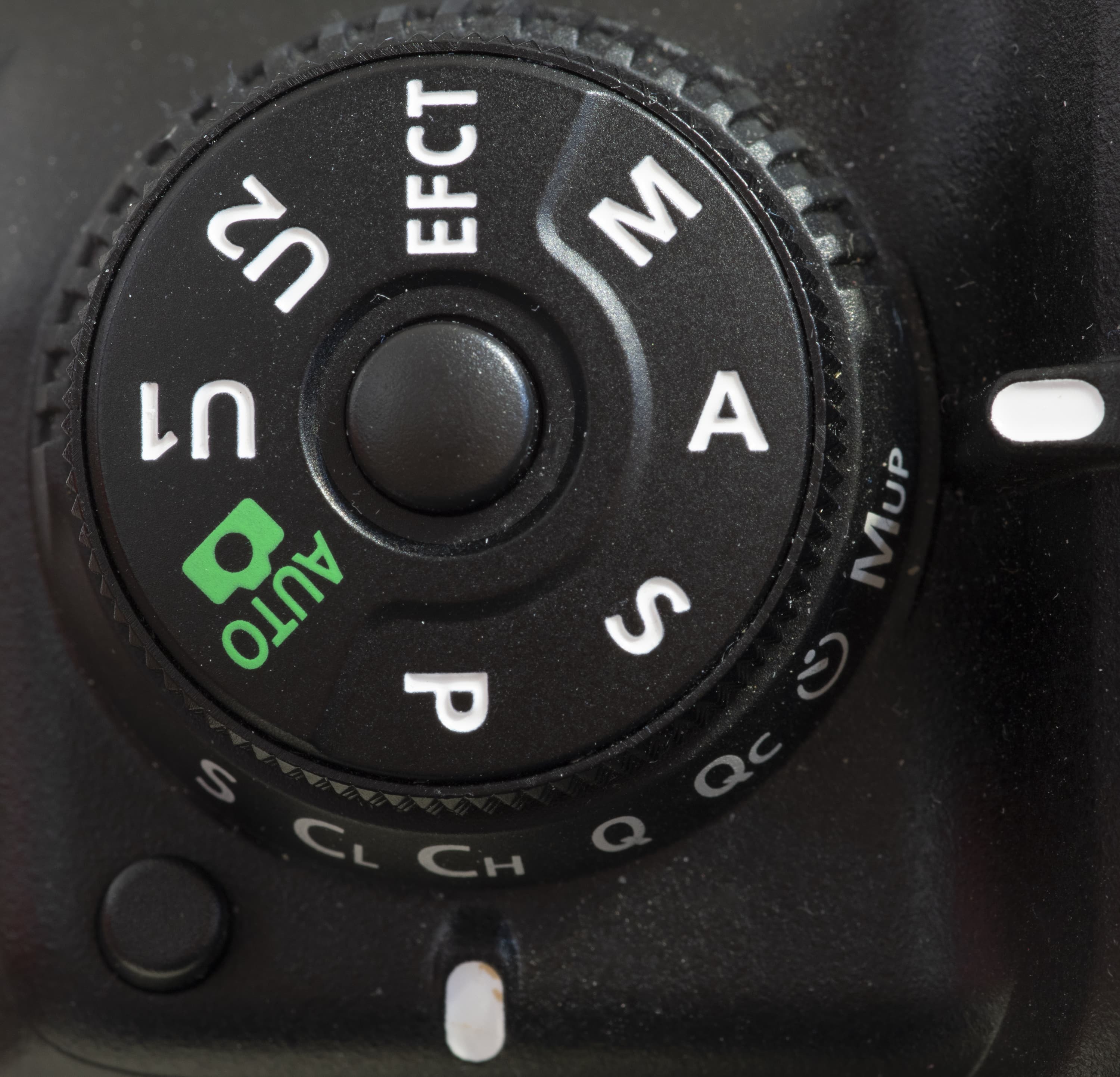 Помимо традиционных P, S, A, M и автоматического (Auto) режимов в камере предусмотрена возможность сохранения двух блоков пользовательских настроек (U1 и U2), а также выбор эффектов постобработки (EFCT).