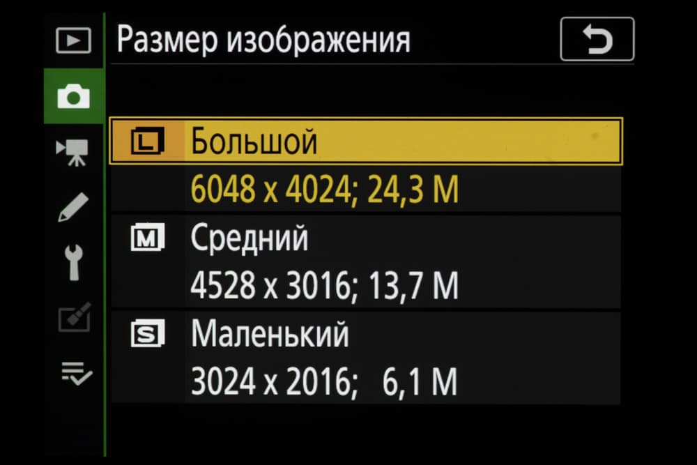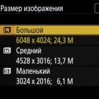| Разрешение фотоснимков | FX (36×24 мм): 6048×4024, 4528×3016, 3024×2016; DX (24×16 мм): 3936×2624, 2944×1968, 1968×1312; 1:1 (24×24 мм): 4016×4016, 3008×3008, 2000×2000; 16:9 (36×20 мм): 6048×3400, 4528×2544, 3024×1696 |