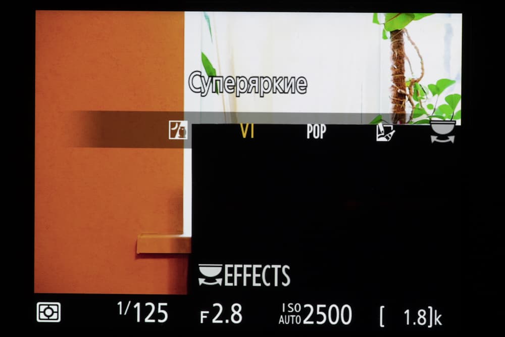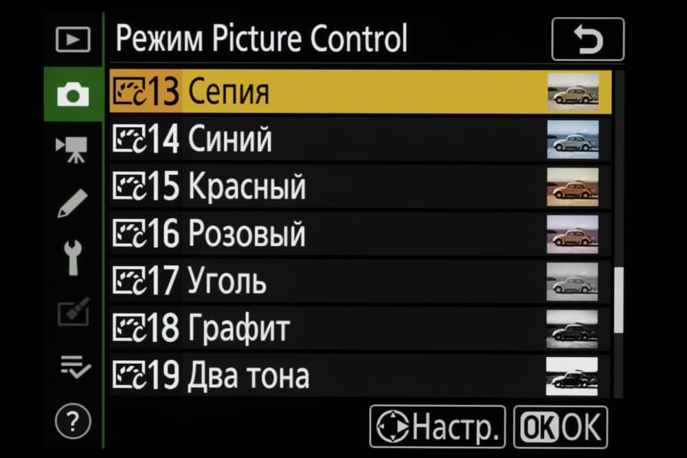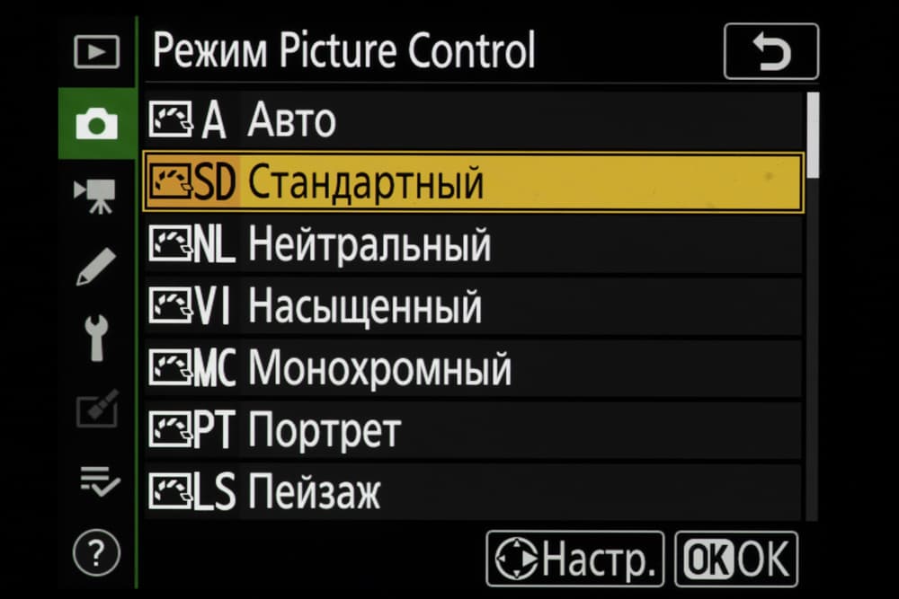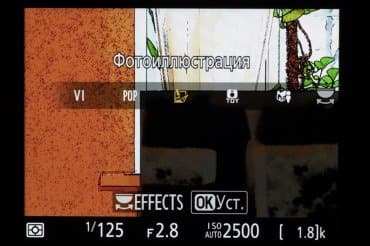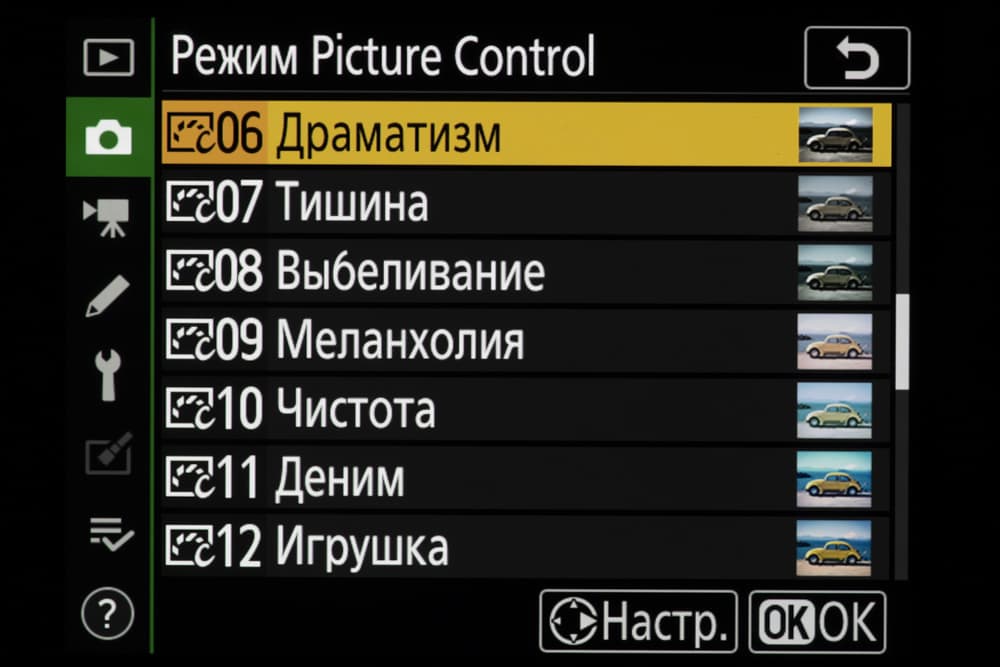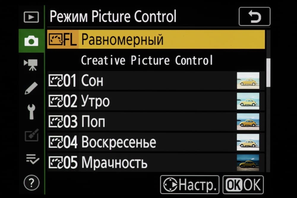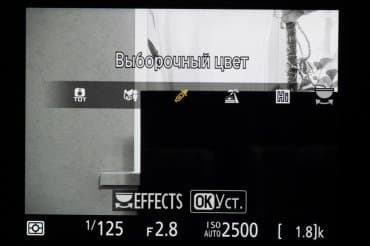 | Внутрикамерная обработка изображений (Picture Control) | «Авто», «Стандартный», «Нейтральный», «Насыщенный», «Монохромный», «Портрет», «Пейзаж» и «Равномерный», творческие режимы Picture Control («Сон», «Утро», «Поп», «Воскресенье», «Мрачность», «Драматичность», «Тишина», «Выбеливание», «Меланхолия», «Чистота», «Деним», «Игрушка», «Сепия», «Синий», «Красный», «Розовый», «Уголь», «Графит», «Сажа»); возможность изменения выбранного режима Picture Control и сохранения пользовательских режимов |