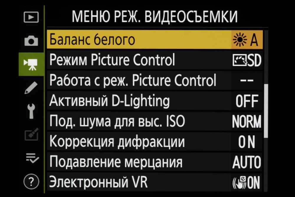 При выводе видео через интерфейс HDMI на внешний рекордер Nikon D780 позволяет сохранять 10-битные данные цветности и выравнивать контраст в параметрах Log-N или HLG для последующей тональной и цветовой коррекции в видеоредакторе. Однако эти опции не поддерживаются в стандартном режиме, когда запись ведется на внутренние карты памяти.