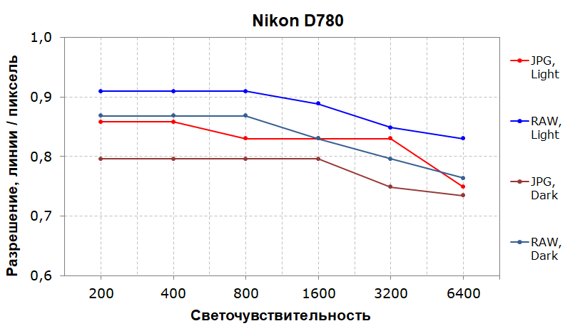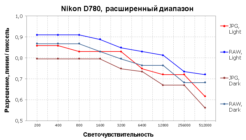 В расширенном диапазоне светочувствительности разрешение во всех сценах продолжает равномерно снижаться, доходя до 70% в RAW и до 60% в JPEG, что является неплохим результатом для ISO 51200.