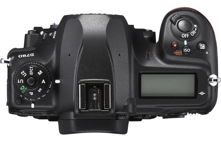 Сверху также видны характерные черты привычной компоновки зеркальной камеры вообще и никоновской в частности: главный селектор программ (слева) с кольцом выбора режимов «протяжки», полнофункциональный «горячий башмак», информационный дисплей на жидких кристаллах (с подсветкой, активируемой рычагом выключения питания), спуск затвора, а также кнопки активации видеозаписи, установки ISO и ввода экспокоррекции.