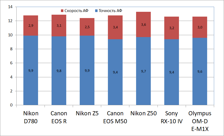В общем зачете по скорости АФ камера находится далеко не на первом месте нашего рейтинга, даже ниже Nikon Z50, хотя выше Nikon Z5. Зато по точности Nikon D780 обгоняет практически все ранее протестированные камеры и встает на одну ступень с Z5. В итоге суммарный рейтинг все же обеспечивает камере место в первых рядах.