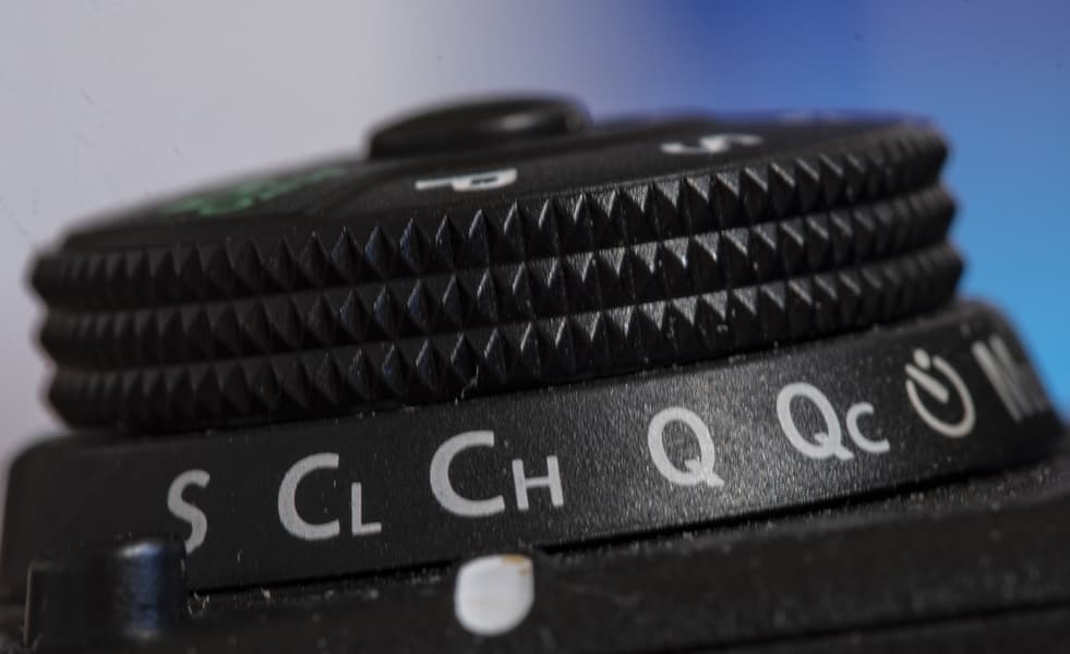 Доступные опции (слева направо): однокадровый режим (S), непрерывная съемка с низкой скоростью (CL), непрерывная съемка с высокой скоростью (CH), бесшумная съемка (Q), бесшумная непрерывная съемка (QC), съемка с автоспуском по таймеру (циферблат часов) и съемка с предварительным подъемом зеркала (MUp).
