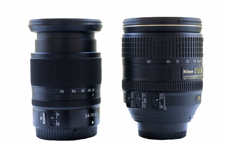 При зумировании объективы удлиняются, но если у Nikon AF-S Nikkor 24-120mm f/4G ED VR есть положение без удлинения тубуса (при съемке на минимальном фокусном расстоянии), то у Nikon Z Nikkor 24-70mm f/4 S для съемки даже в максимально широкоугольном положении нужно сначала повернуть кольцо трансфокатора. При этом длина объектива почти сравняется с длиной соперника.