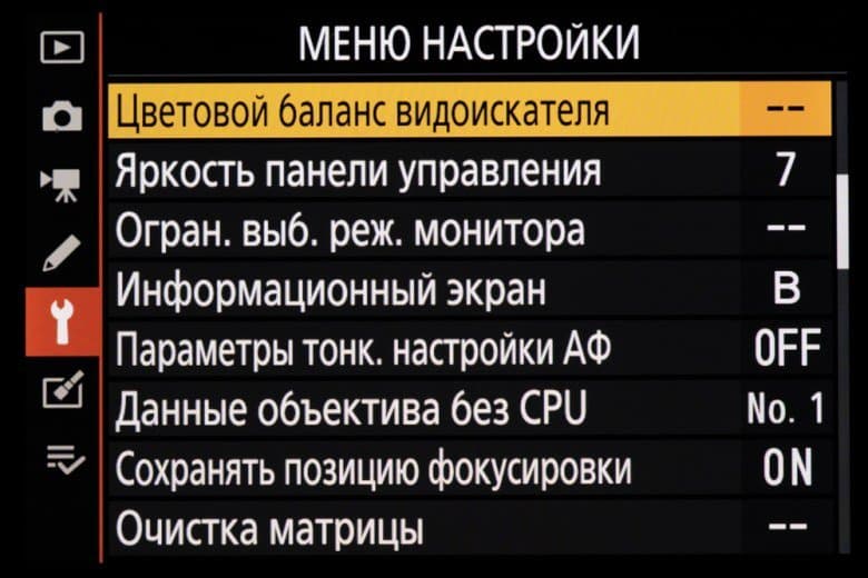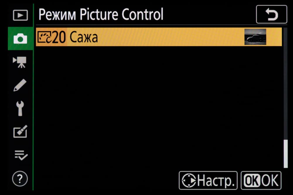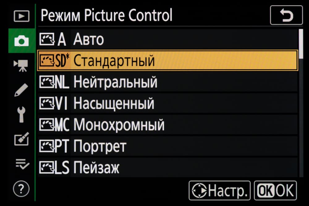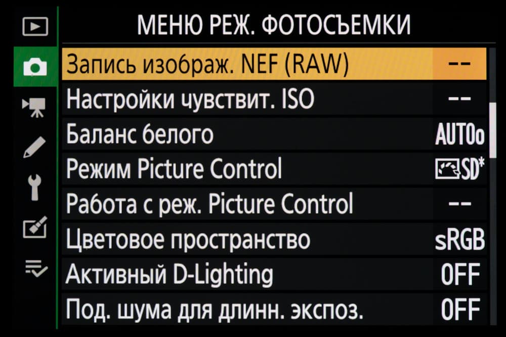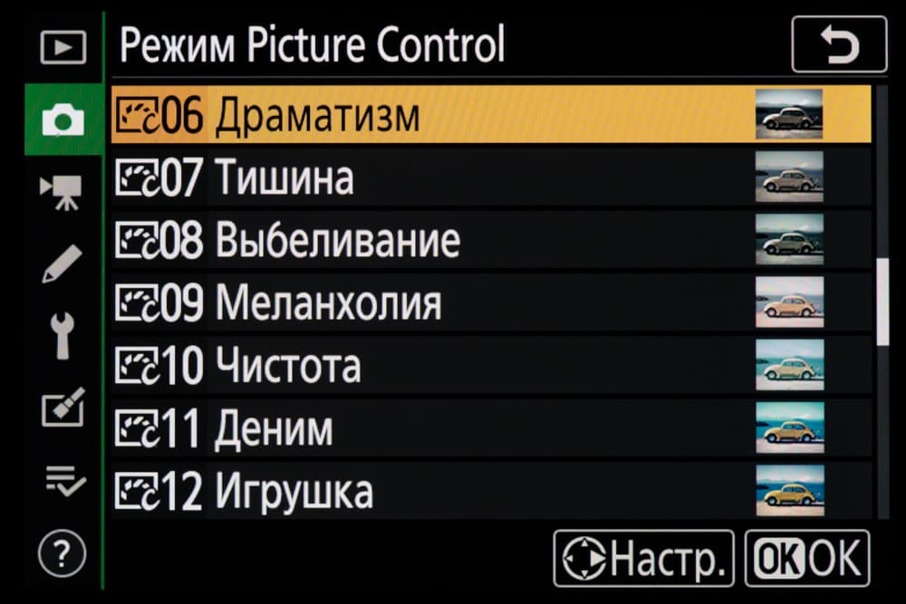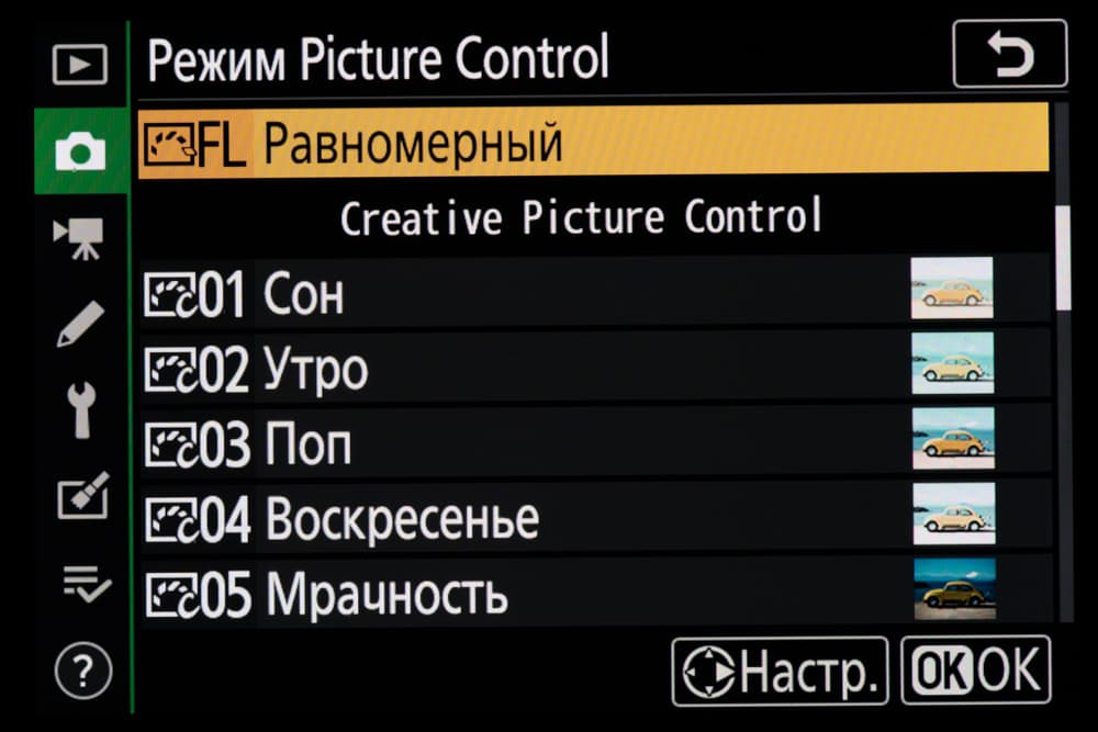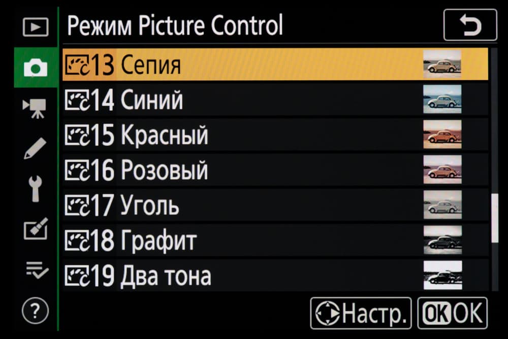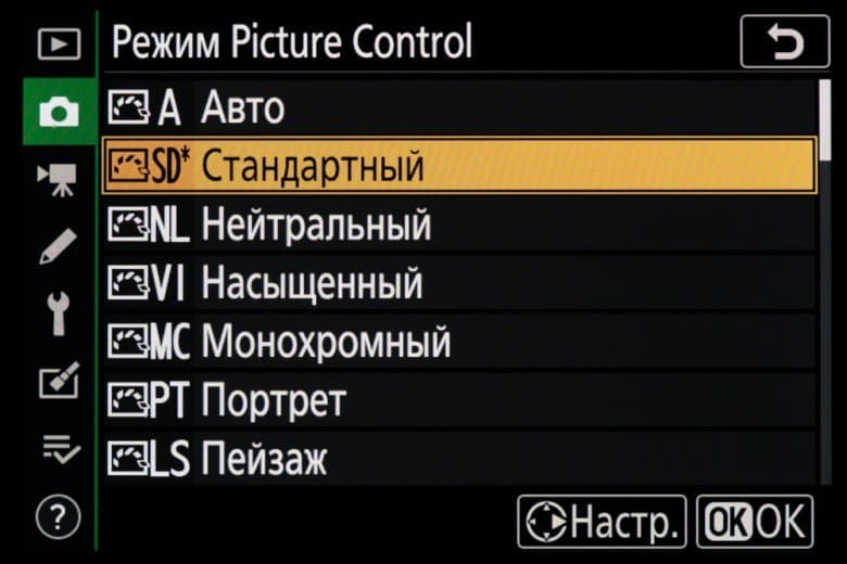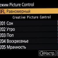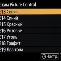 | Эффекты изображения (Picture Control) | Цветность: авто, стандарт, нейтральный, насыщенный, монохром, портрет, пейзаж, равномерный; Творческие режимы: сон, утро, популярный, воскресенье, мрачность, драма, тишина, выбеливание, меланхолия, чистота, деним, игрушка, сепия, синий, красный, розовый, уголь, графит, сажа |
