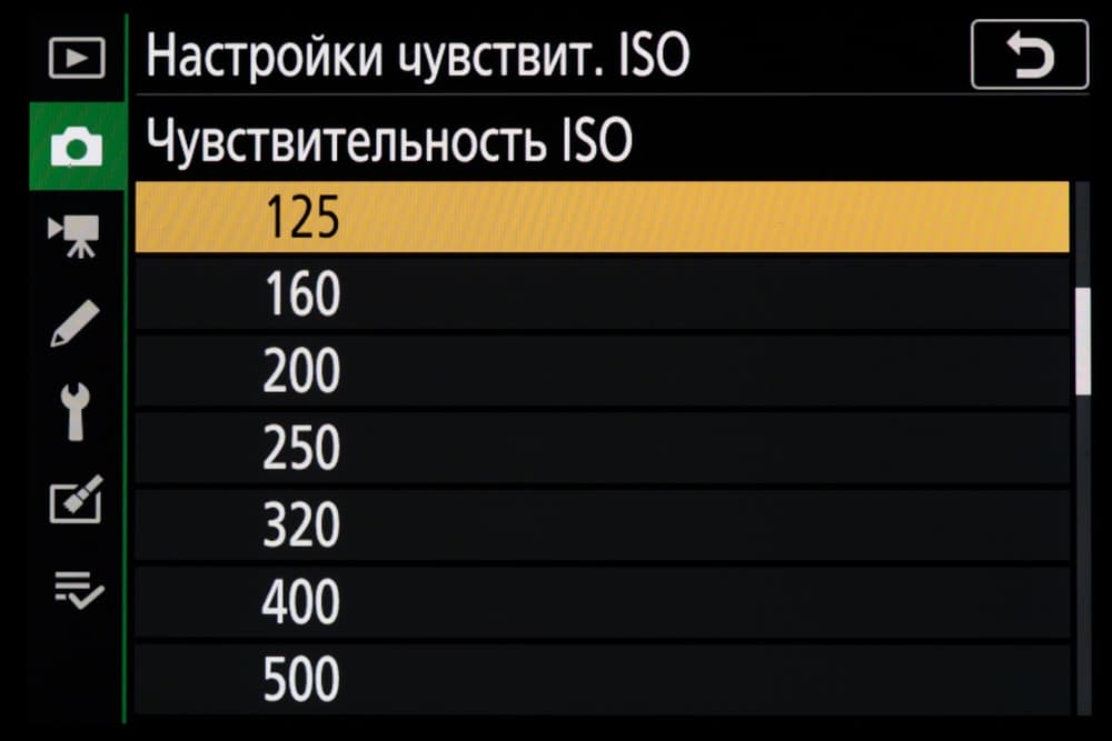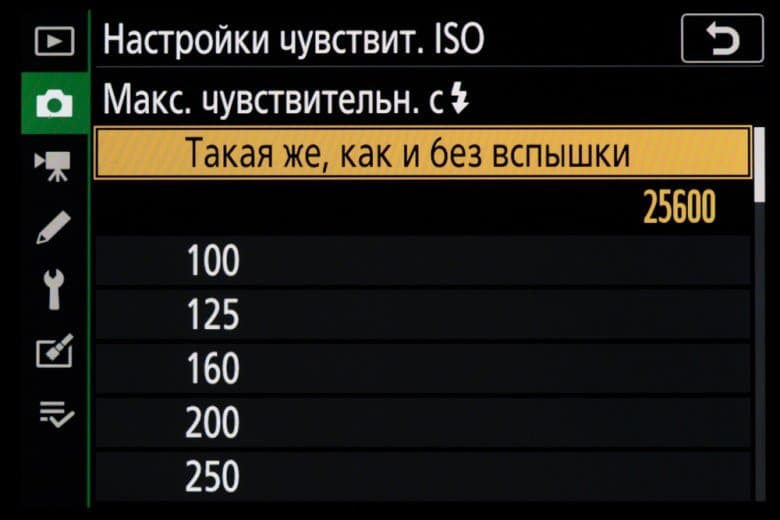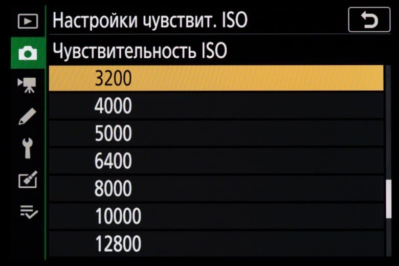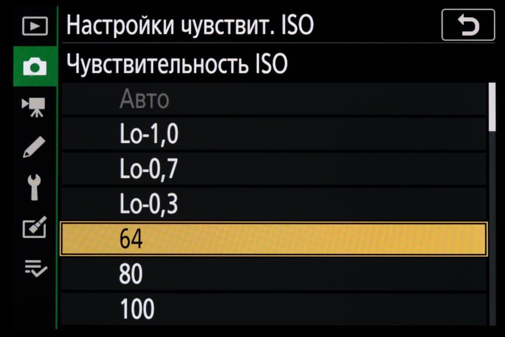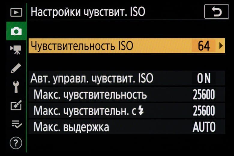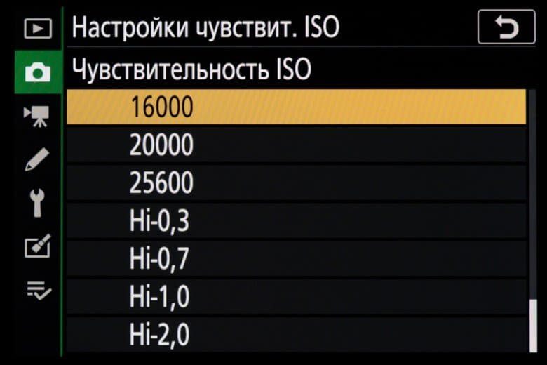 | Эквивалентная светочувствительность | ISO 64 — 25 600, расширение до ISO 32 — 102 400 |