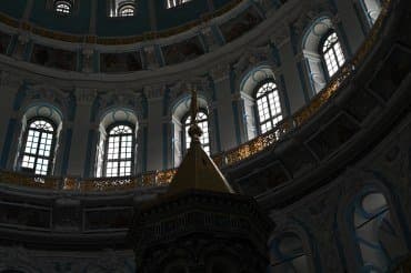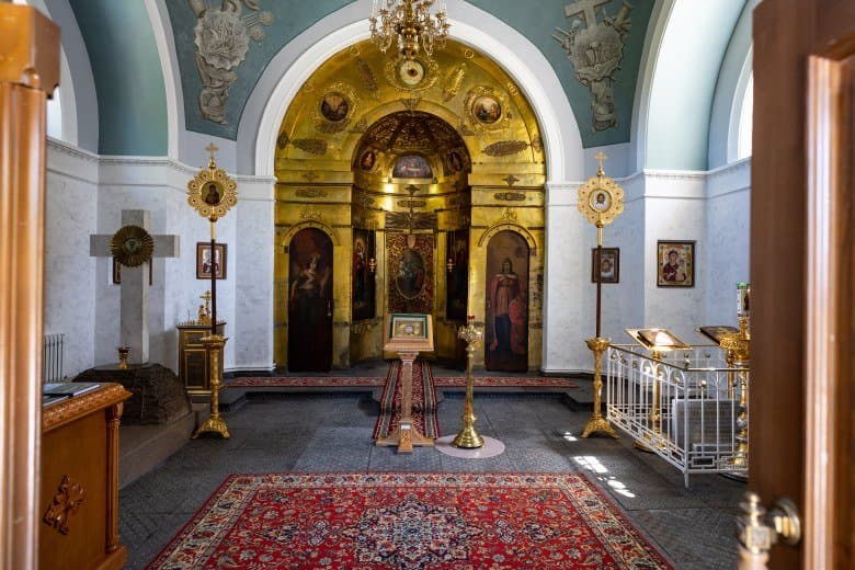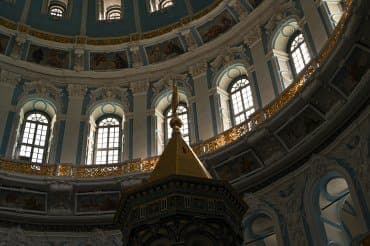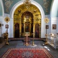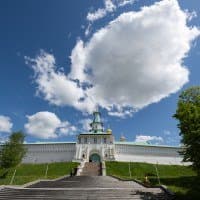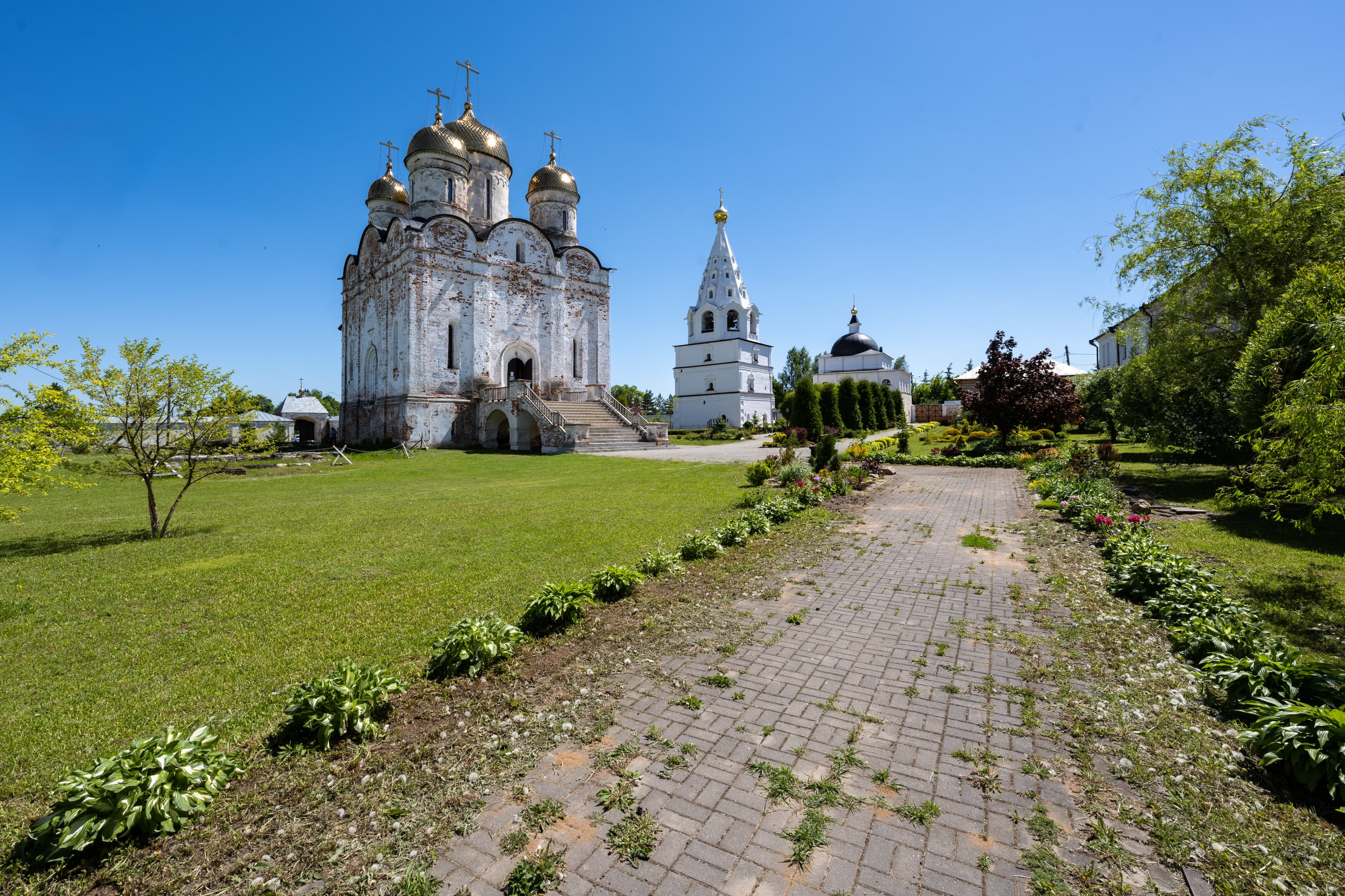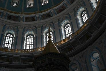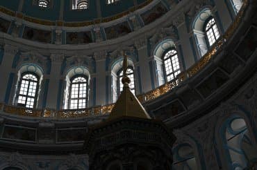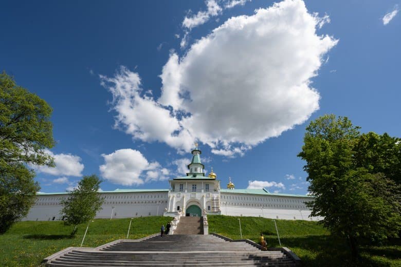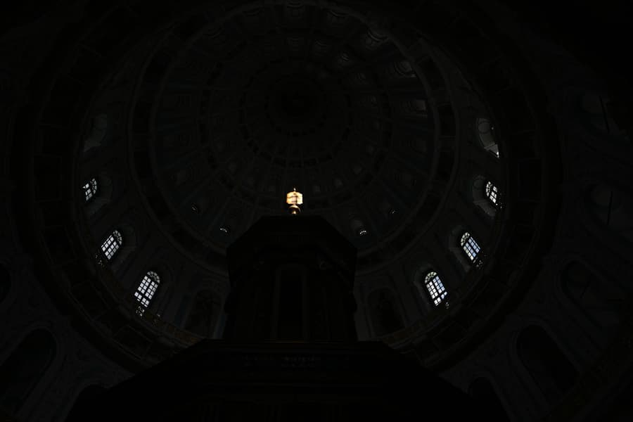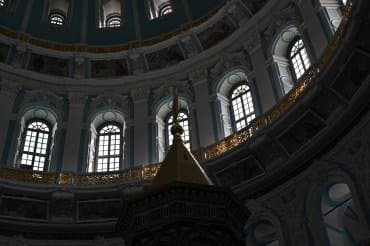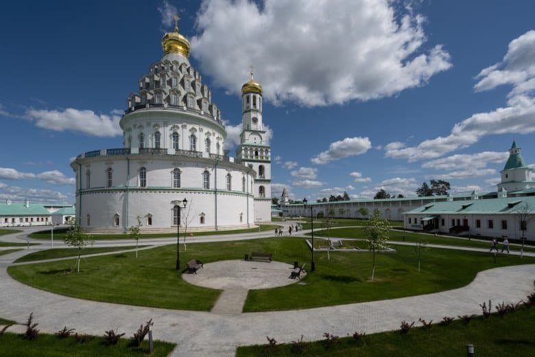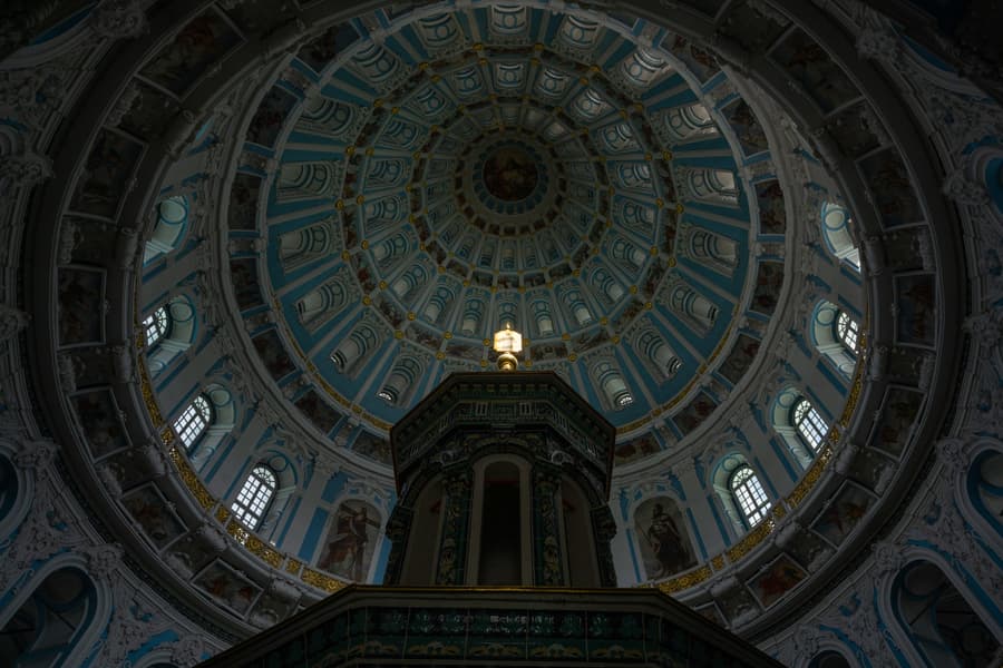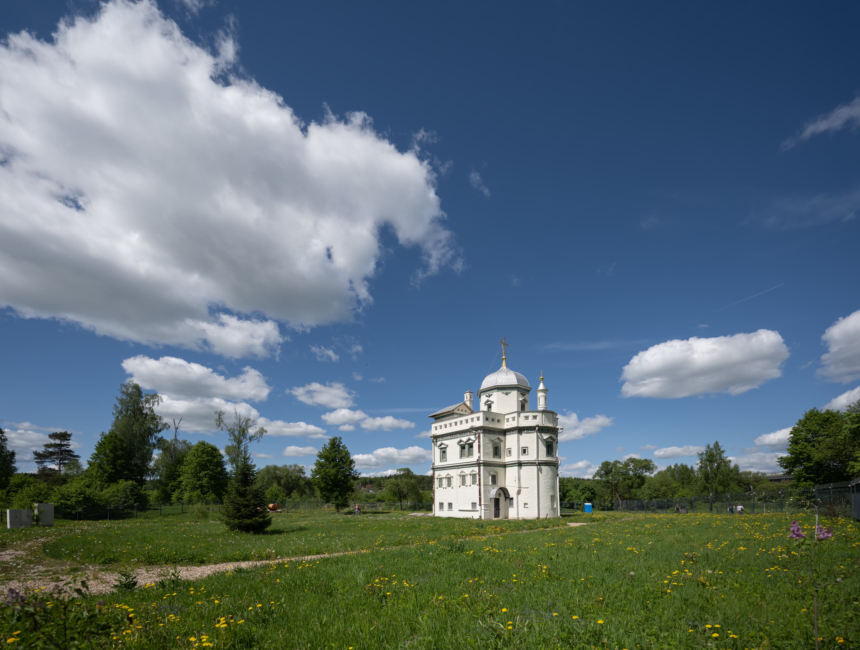 Мы сделали снимок в Воскресенском соборе Новоиерусалимского монастыря с объективом Nikkor Z 20mm f/1.8 S при F5,6; 1/200 c; ISO 64, специально введя экспокоррекцию −4 ступени, поскольку наиболее интересным нам представлялся здесь образ Христа, ярко освещенный солнцем, проникавшим сквозь окна. При нормальной экспозиции он оказывался совершенно пересвеченным.