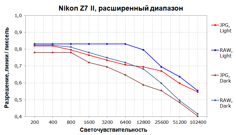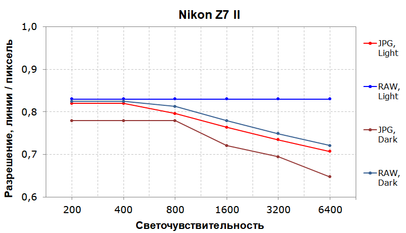 RAW в обеих сценах и JPEG в светлой сцене практически не отличаются до ISO 800, что говорит о хорошей внутрикамерной обработке. А вот JPEG в темной сцене ведет себя гораздо хуже. В светлой сцене при съемке в RAW разрешение стабильно держится на уровне 82% вплоть до ISO 6400. В темной сцене разрешение RAW начинает падать с ISO 800 и далее идет параллельно с JPEG светлой сцены, оставаясь выше 70% вплоть до ISO 6400 (80%). В целом, показатели высокие и стабильные, хотя и немного ниже, чем у младшей модели Z6 II, особенно на высоких значениях светочувствительности.