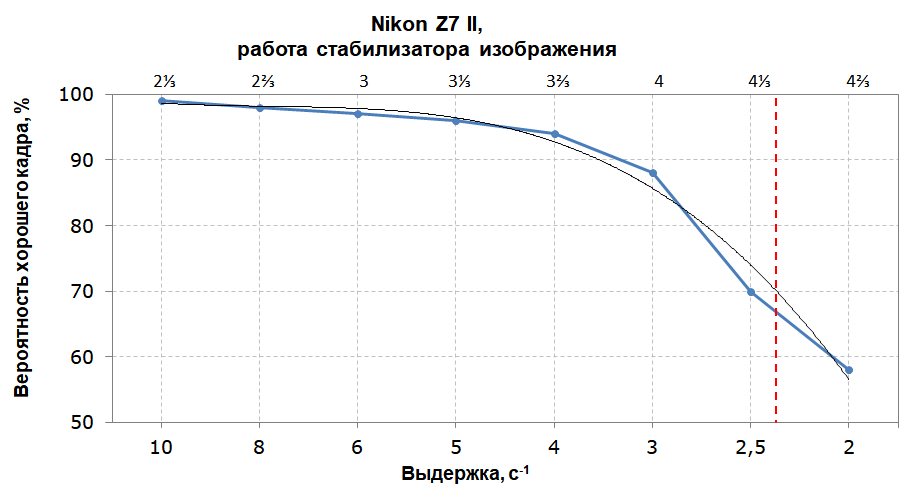 На русскоязычном сайте производитель не указывает эффективность стабилизатора, а на англоязычном ресурсе imaging.nikon.com приведено значение в 5 ступеней экспозиции. Наша методика позволяет оценить эффективность стабилизатора примерно в 4 ступени экспозиции с выходом годных 70% — это хороший результат.