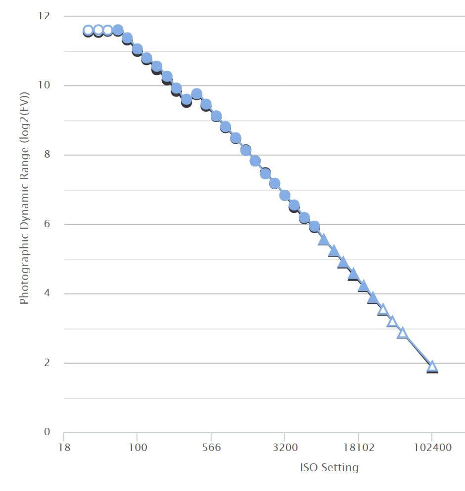 Производитель не стал серьезно улучшать и без того удачное решение. Новинка оснащена таким же сенсором, как и ее предшественница — это касается всех его характеристик, рабочего и расширенного диапазонов ISO и хорошо иллюстрируется измерениями динамического диапазона (ДД), проведенными Уильямом Дж. Клаффом (William J. Claff) и представленными на сайте PhotonsToPhotos.net.