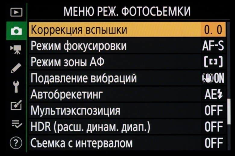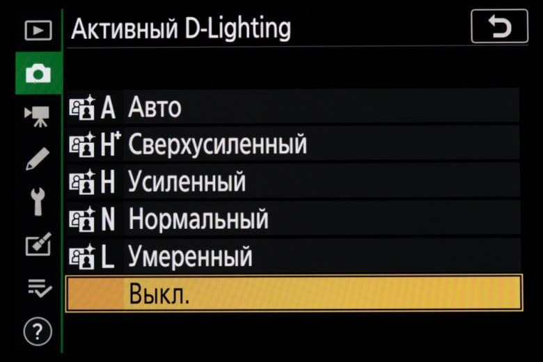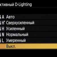 | Active D-Lighting (расширение динамического диапазона) | авто, сверхусиленный, усиленный, нормальный, умеренный, выключено |