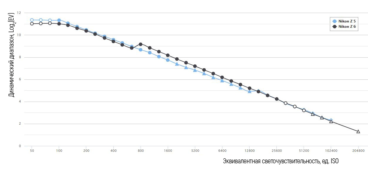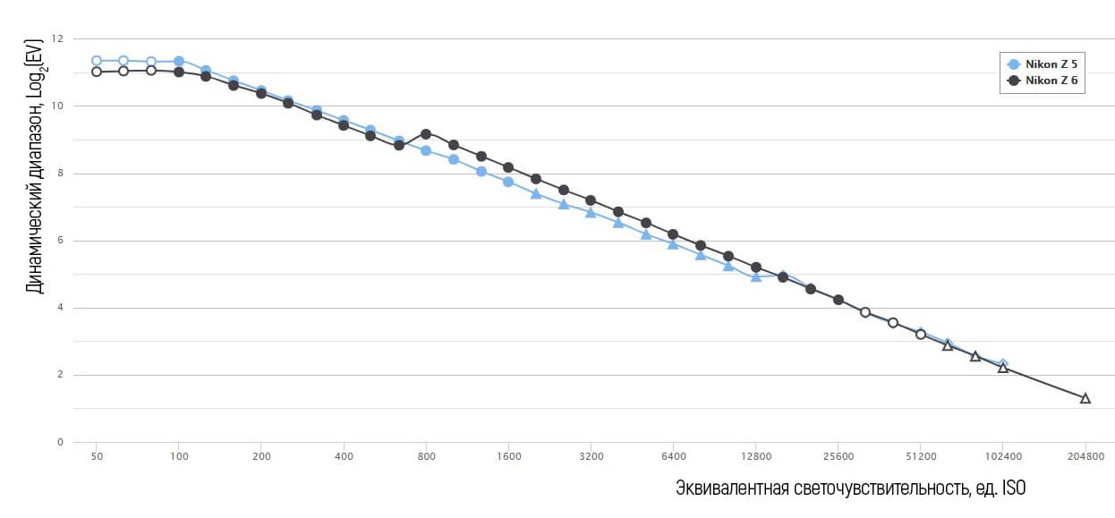Начиная с ISO 800, Nikon Z6 демонстрирует более привлекательные показатели. А при ISO 14000 и выше динамический диапазон сенсоров обеих камер практически не отличается. Выигрыш Nikon Z5 в фотографической широте при ISO 50-600 весьма ценен. Опережение при ISO 800—12800 у Nikon Z6 есть следствие более технологически прогрессивной архитектуры сенсора BSI-CMOS (с обратной подсветкой).