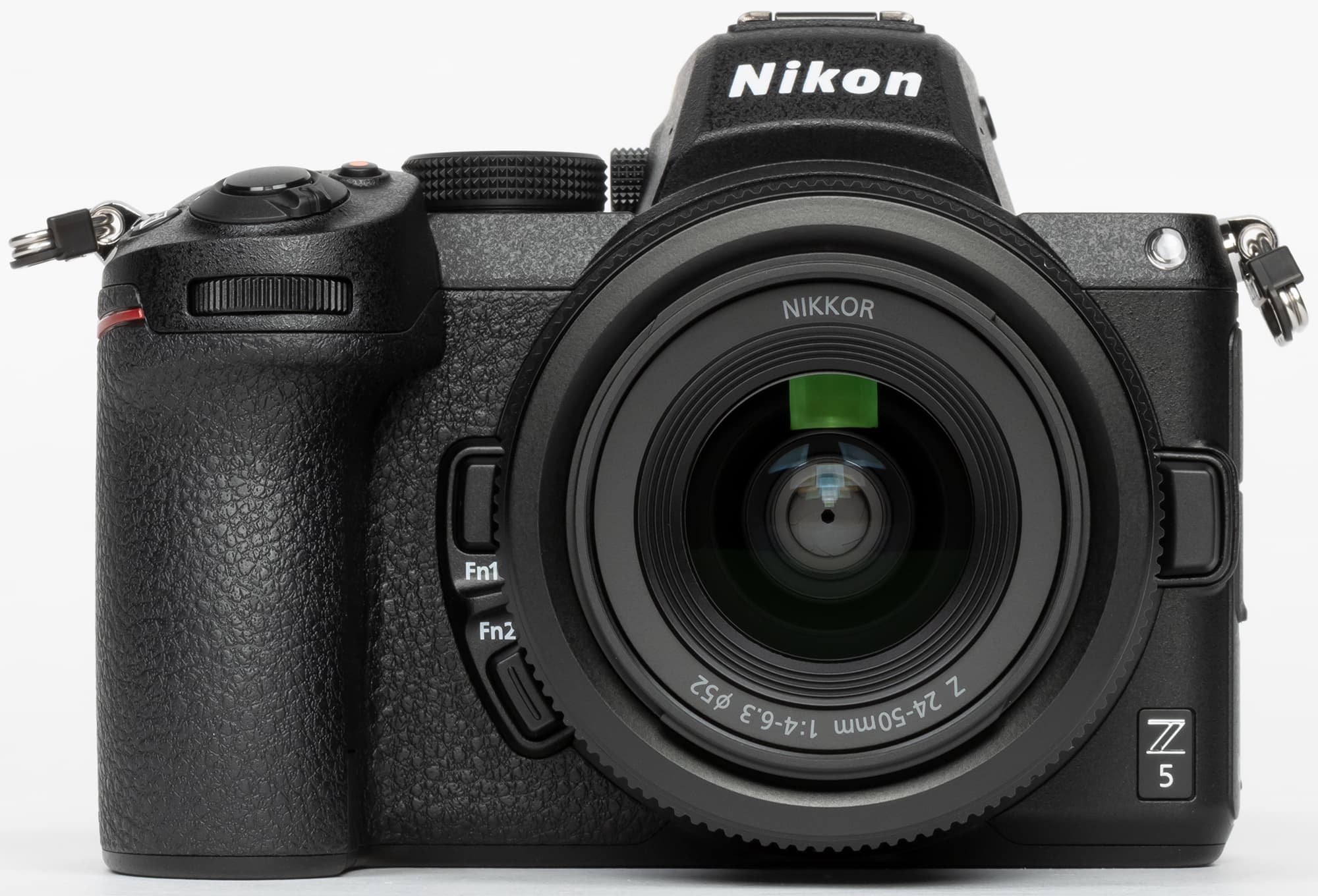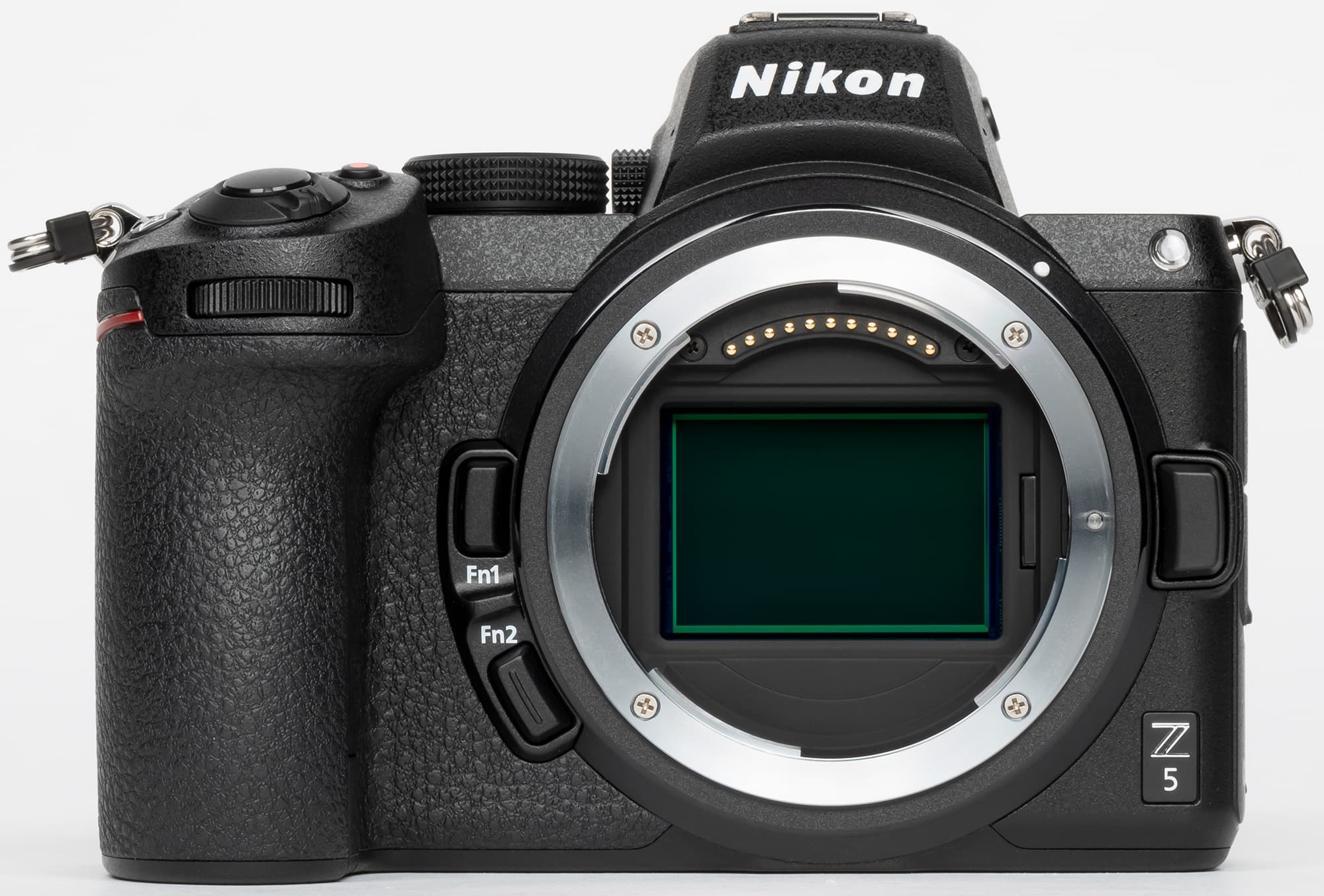 При взгляде анфас вокруг кольца байонета обнаруживаются традиционные для производителя детали: клавиша разблокировки объектива (на трех часах) и две функциональные кнопки Fn1 и Fn2. В верхнем правом углу расположен прожектор подсветки автофокуса (АФ), в верхнем правом — переднее колесо установки параметров съемки и кнопка спуска затвора с обнимающим ее рычажком выключателя питания.