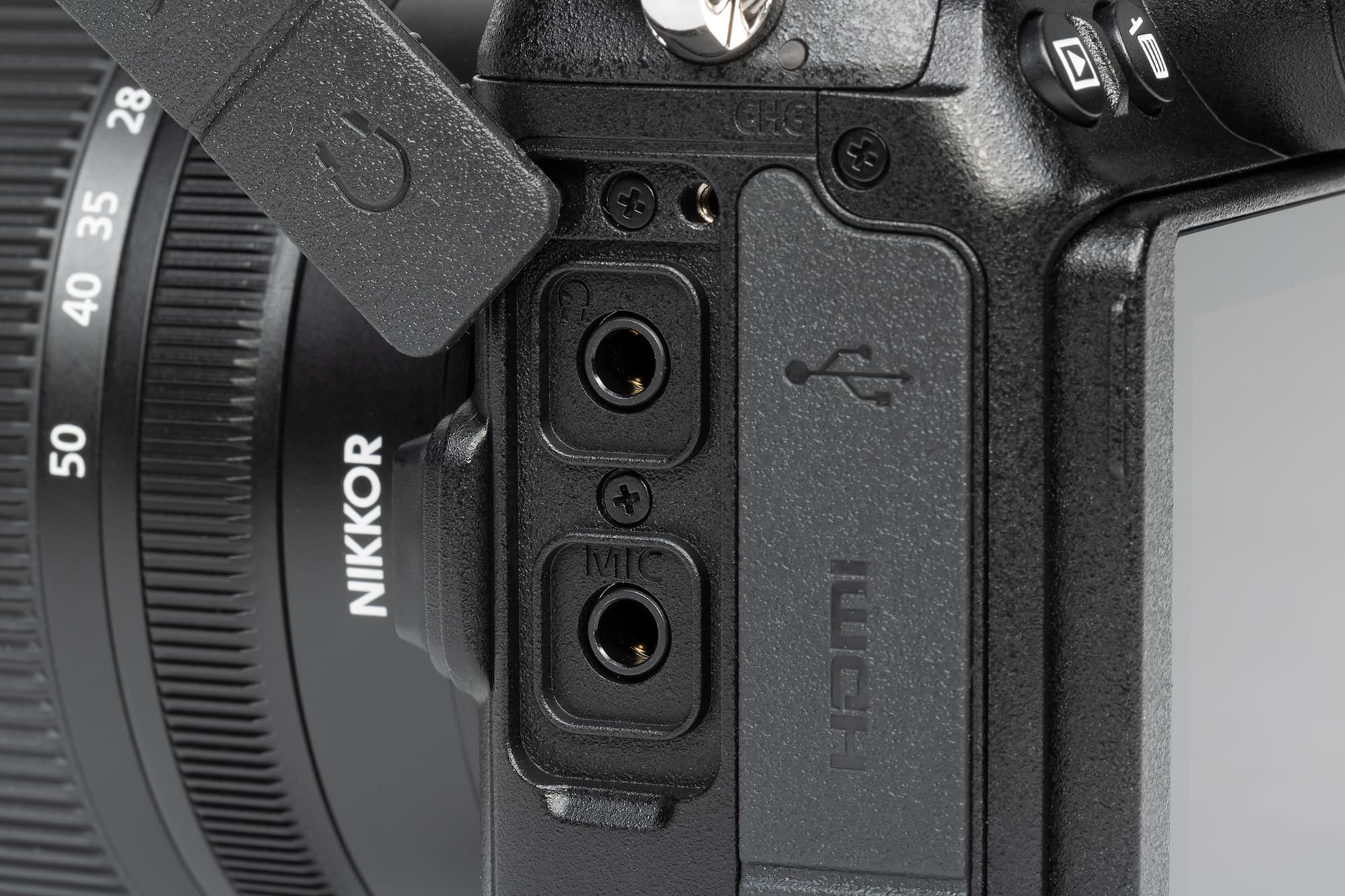 Ближе к байонету расположен блок аудиоразъемов (это стандартные 3,5-миллиметровые джеки): сверху выход на наушники, снизу — вход для внешнего микрофона.