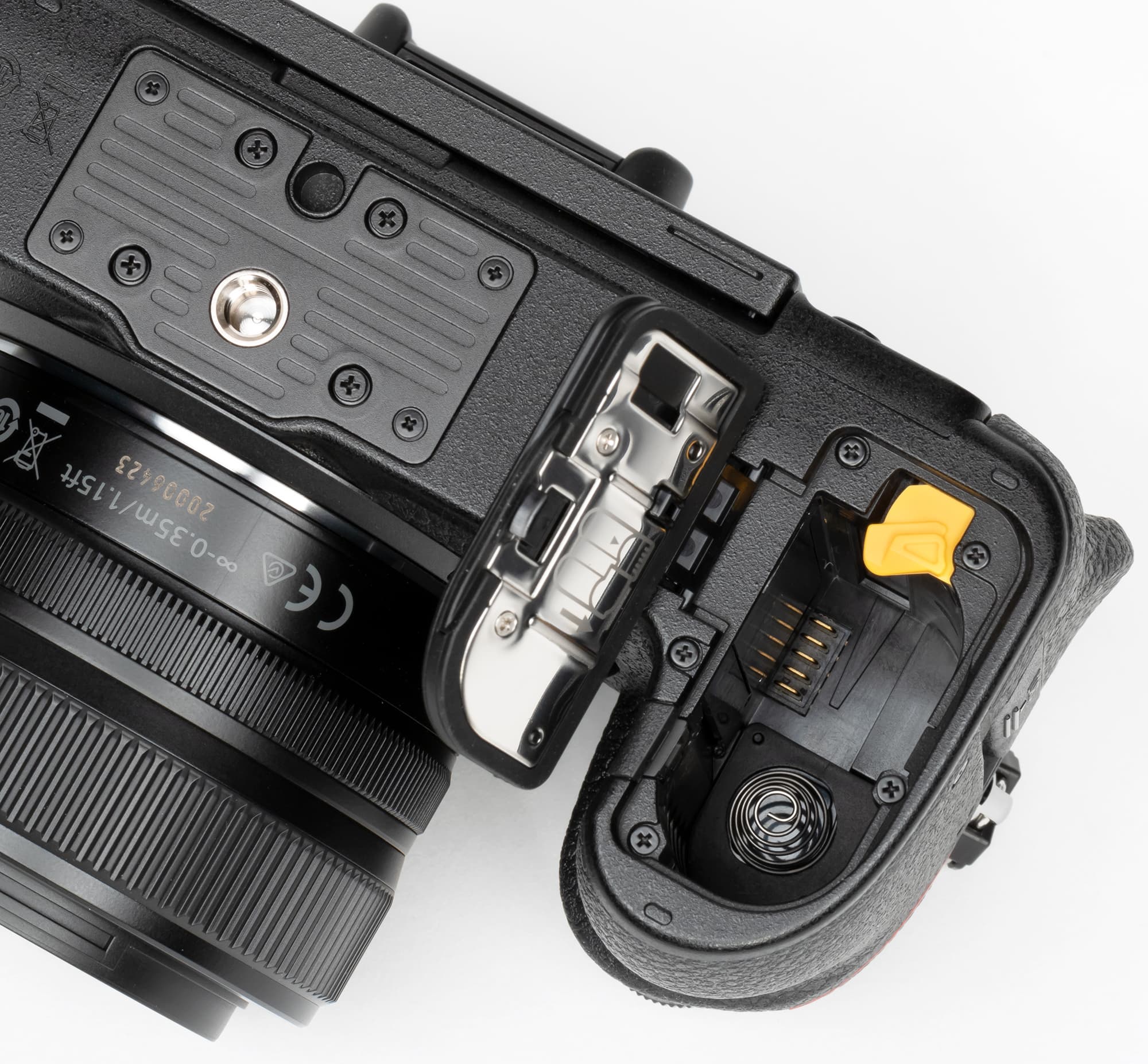 Снизу имеется отсек для батареи, закрывающийся крышкой с замком, а также стандартная резьба для крепления к штативу.