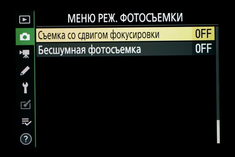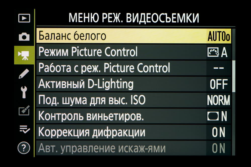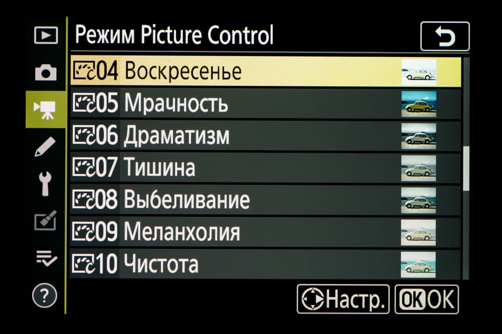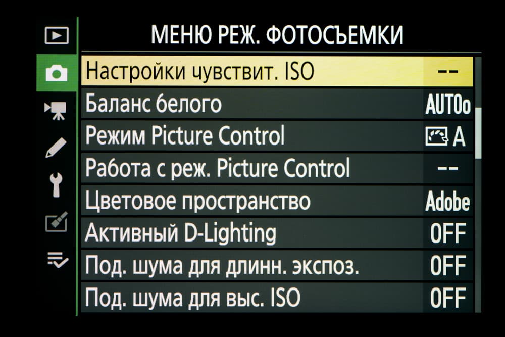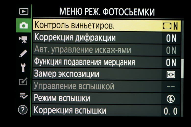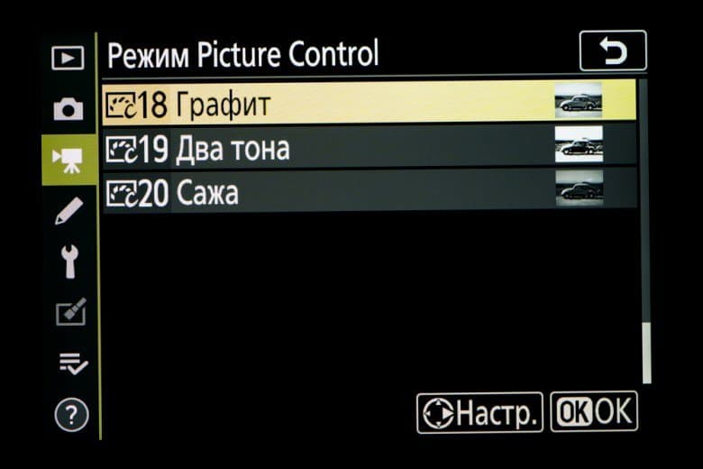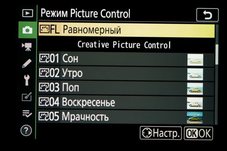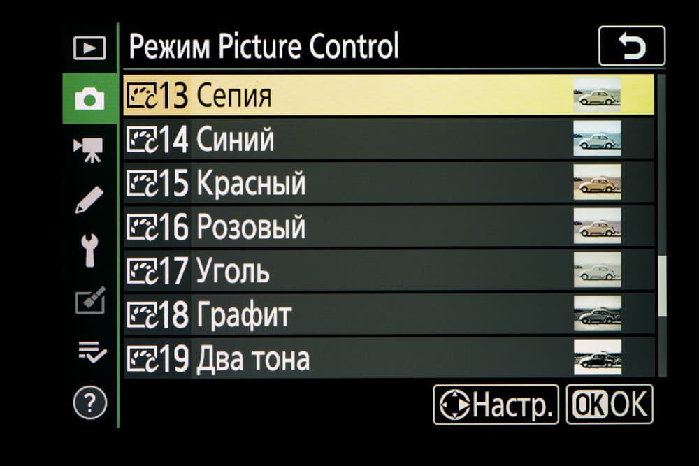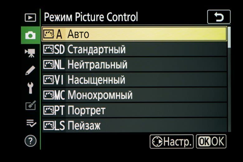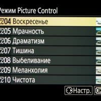 | Внутрикамерная обработка изображений (Picture Control) | базовые режима: «Авто», «Стандартный», «Нейтральный», «Насыщенный», «Монохромный», «Портрет», «Пейзаж» и «Равномерный»; творческие режимы: «Сон», «Утро», «Поп», «Воскресенье», «Мрачность», «Драматичность», «Тишина», «Выбеливание», «Меланхолия», «Чистота», «Деним», «Игрушка», «Сепия», «Синий», «Красный», «Розовый», «Уголь», «Графит», «Два тона», «Сажа» |