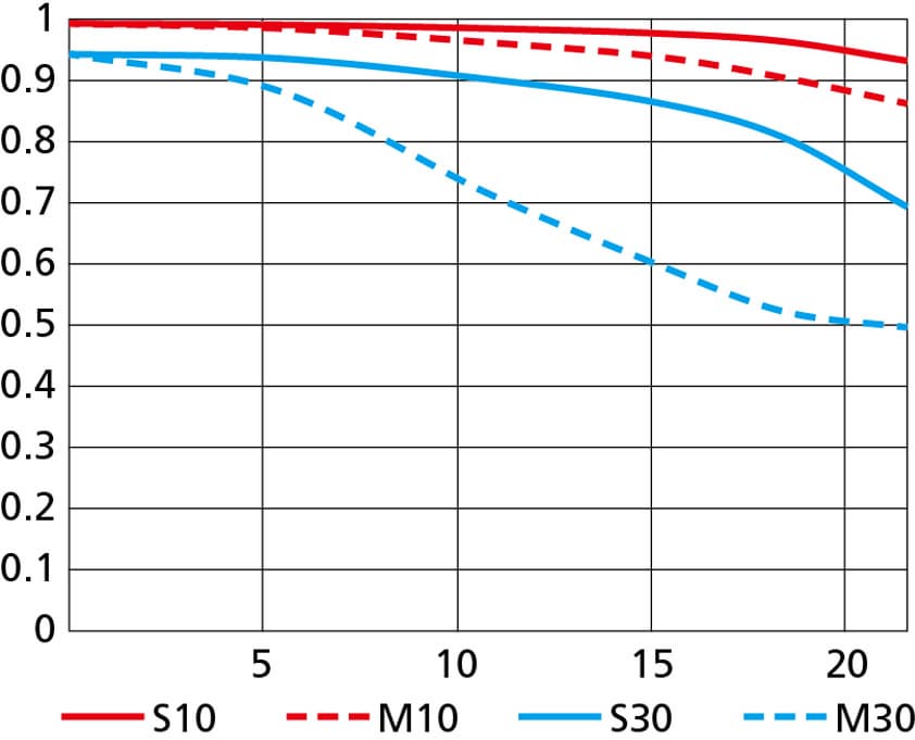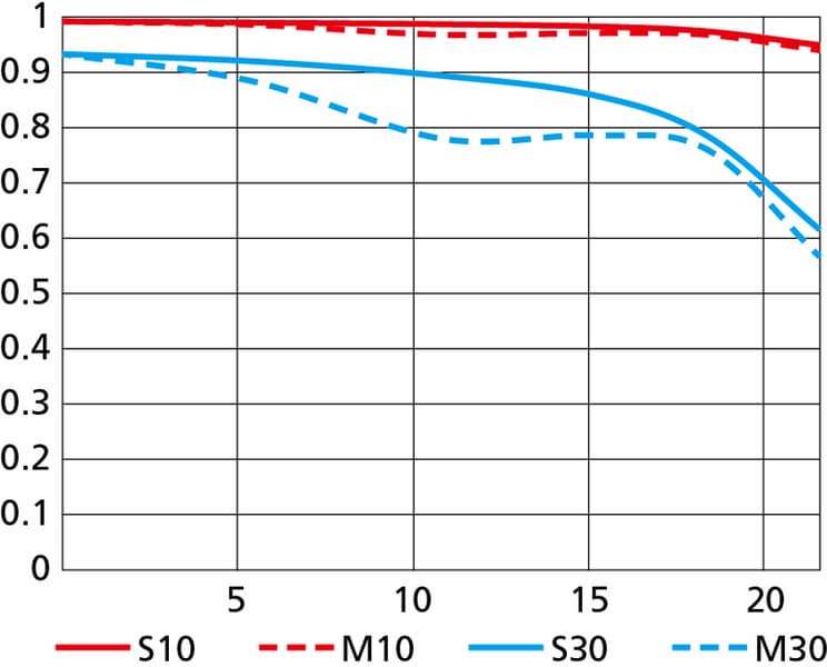 Разрешающая способность в широкоугольном положении весьма высокая — в среднем на уровне почти 90% в центре кадра вплоть до f/13. Разброс между краем и центром кадра значительный: на краю кадра в том же диапазоне диафрагмирования разрешающая способность в среднем на уровне 70%.