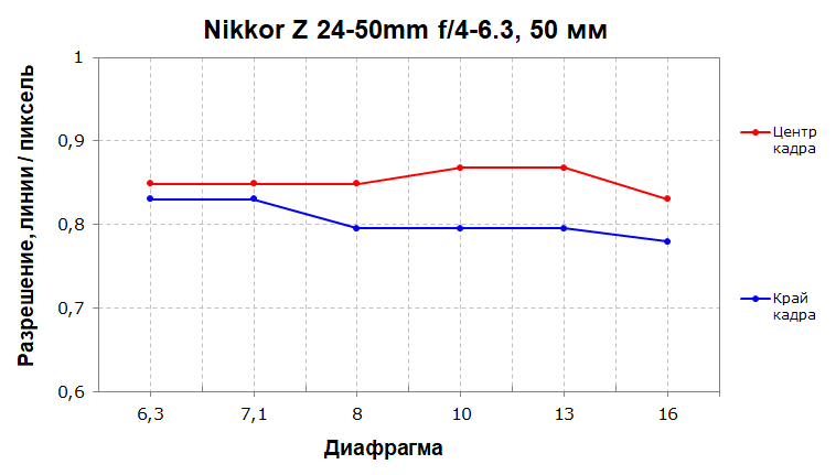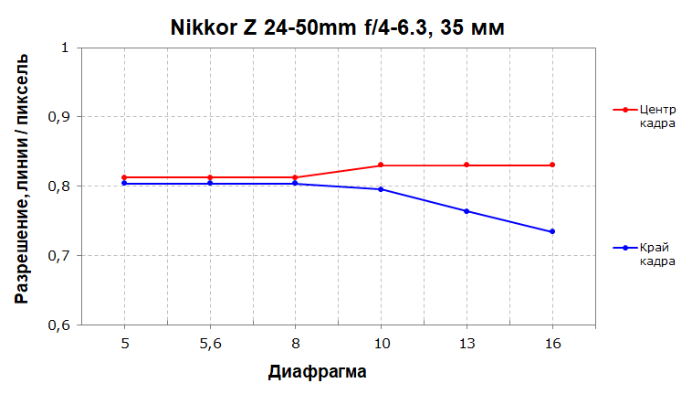 На среднем фокусном расстоянии разрешающая способность в центре кадра опускается до 80% и держится стабильно на всем диапазоне диафрагмирования. Край кадра практически не отстает, и лишь начиная с f/13 уходит ниже 80%.